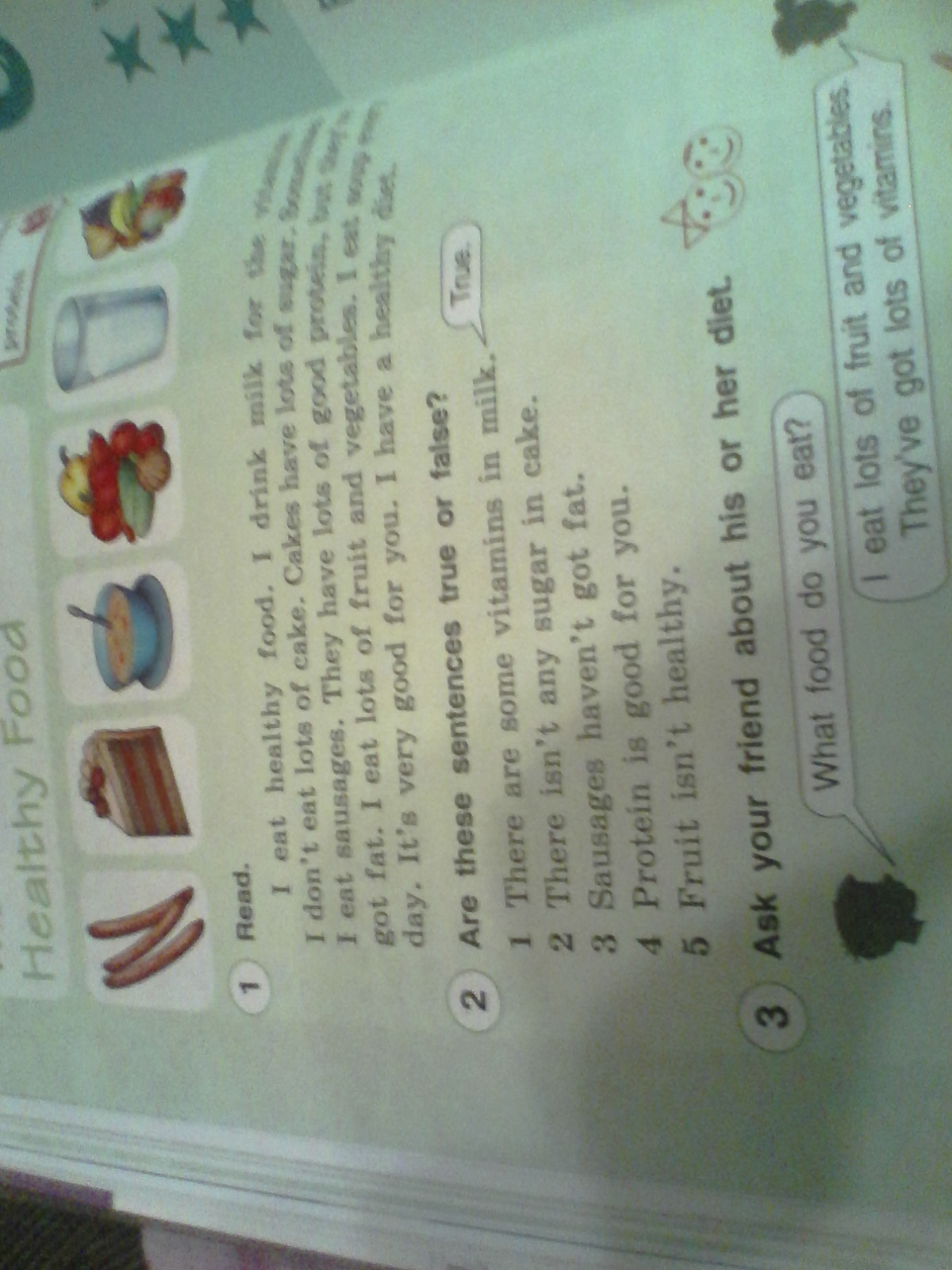 Я ем здоровую пищу. Я пью молоко, чтобы получать витамины. Я не ем много тортов. В тортах содержится много сахара. Иногда я ем сосиски. В них содержатся много хороших протеинов, но в них есть жир. Я ем много фруктов и овощей. Я ем суп каждый день. Это очень хорошо для тебя/вас. У меня здоровая диета.