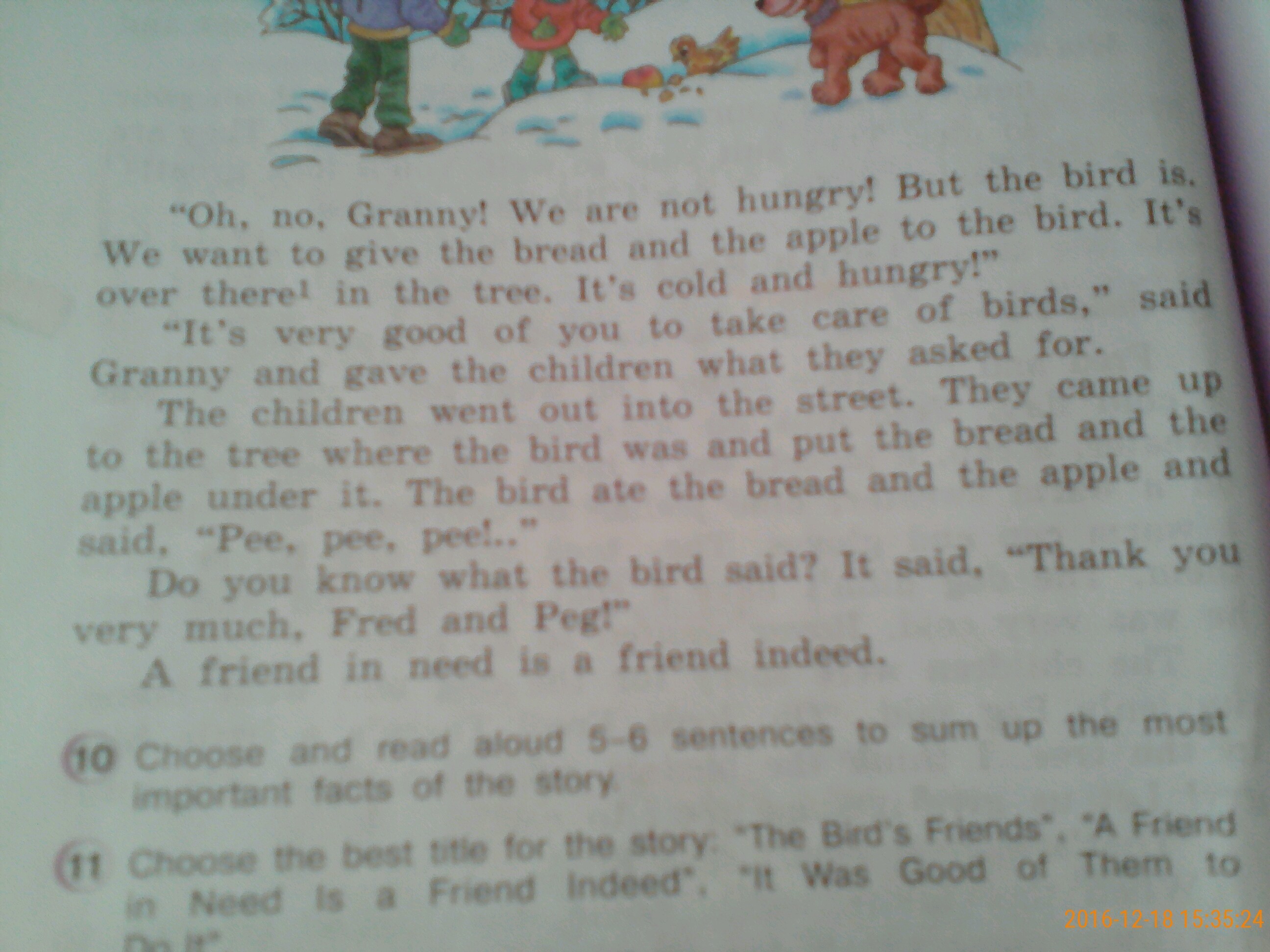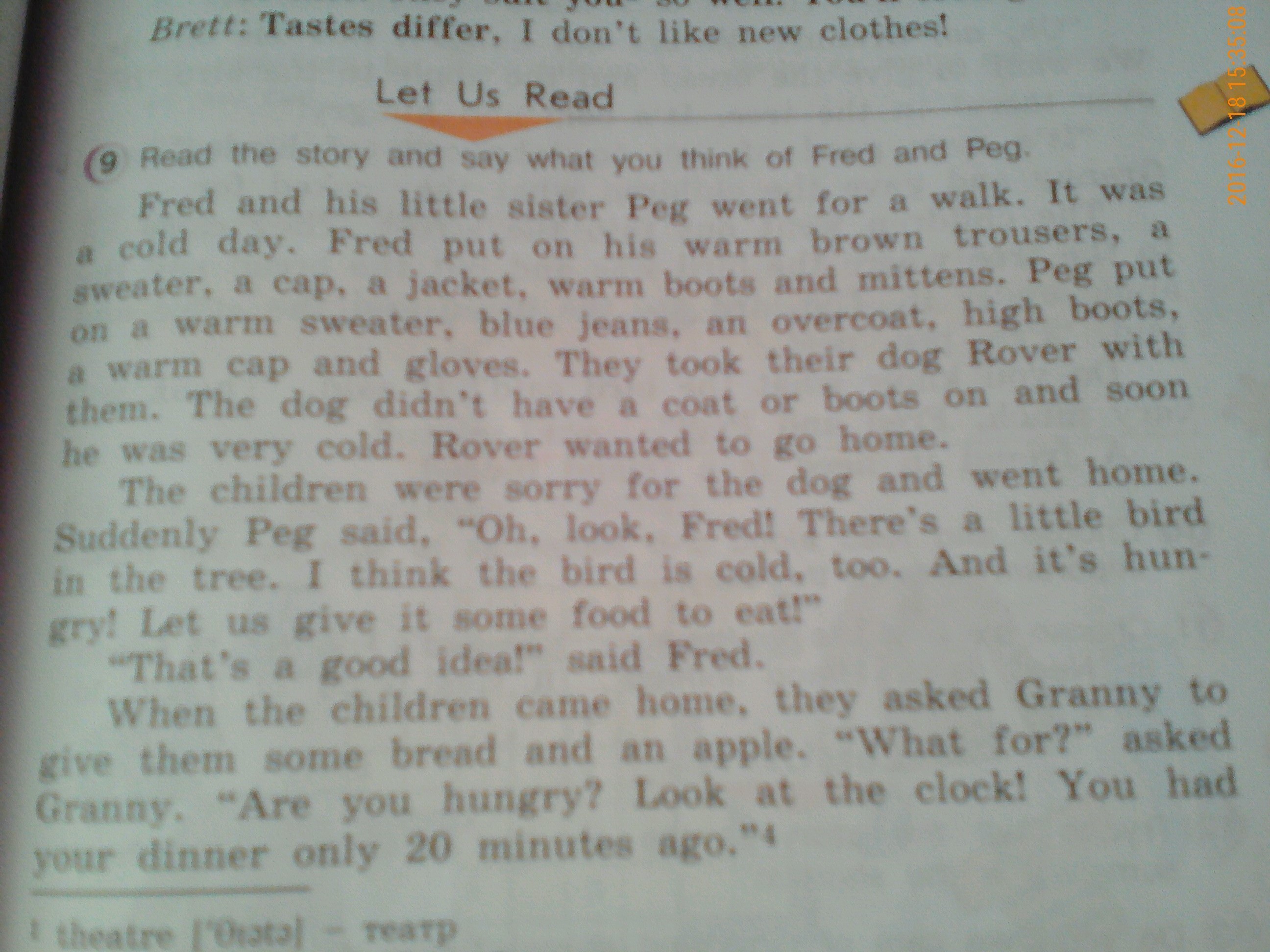 Фред и его маленькая сестра Пег пошли на прогулку. Это был холодный день. Фред надел его теплые коричневые брюки, свитер,шапку, жакет, теплые ботинки и рукавицы. Пег надела теплый свитер, голубые джинсы, пальто, высокие ботинки,шапку и перчатки. Они взяли с собой их собаку Ровера.У собаки не было ни свитера, ни ботинок и вскоре ему стало холодно. Ровер хотел домой. Детям было жалко собаку и они пошли домой. неожиданно Пег сказала:"Ох, смотри, Фред! на дереве маленькая птичка. Я думаю, что птице холодно тоже. и она голодная! давай дадим ей поесть немного еды."это хорошая идея! "- сказал Фред. когда дети пришли домой, они попросили бабушку дать им немного хлеба и яблоко. "зачем? "-спросила бабушка. "вы голодны? "посмотрите на время! у вас был ваш ужин только 20минут назад !