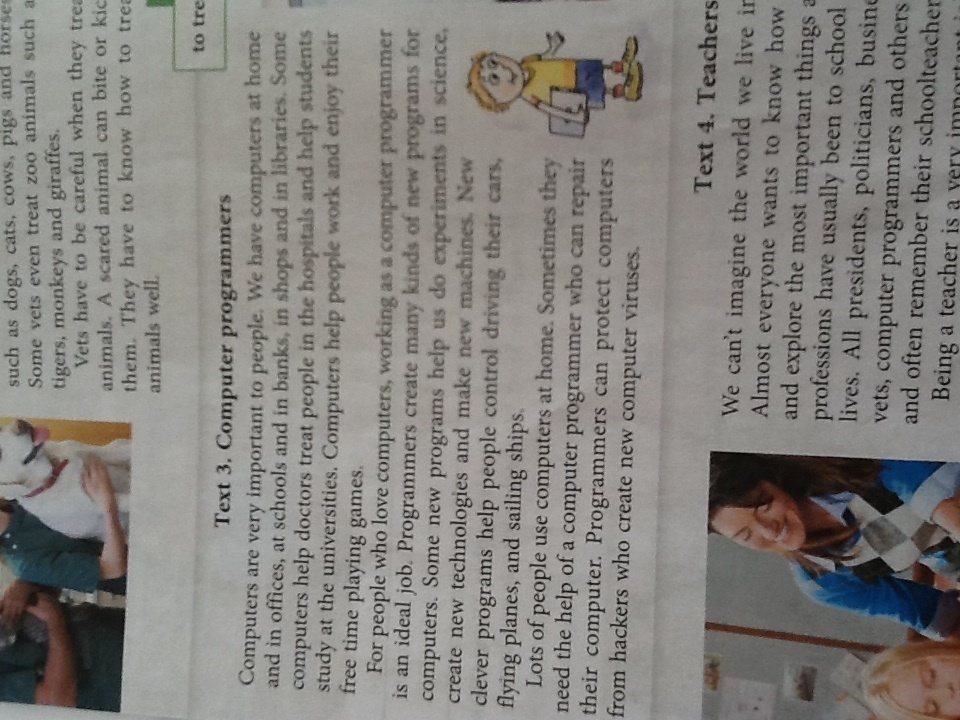 Многие люди используют компьютеры дома. Иногда они нуждаются в помощи программиста, который может починить компьютеры. Программисты могут защитить компьютеры от хакеров, которые создают компьютерные вирусы.