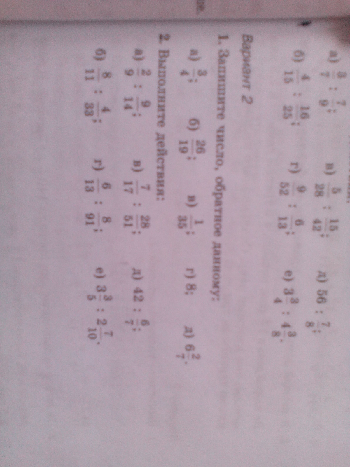 второй вариант 1 .а)3/4=4/3..б)26/19=19/26..в)1/35=35/1..г)8=1/8..д)6 2/7=44/7=7/44.......2..а)2/9:9/4=2/9*4/9=28/18..б)8/11:4/33=8/11*33/8=6...в)7/17:28/51=7/17*51/28=3/4..г)6/13:8/91=6/13*91/8=21/4=5,25..д)42:6/7=42*7/6=1..е)3 3/5:2 7/10=18/5*10/27=4/3=1 1/3