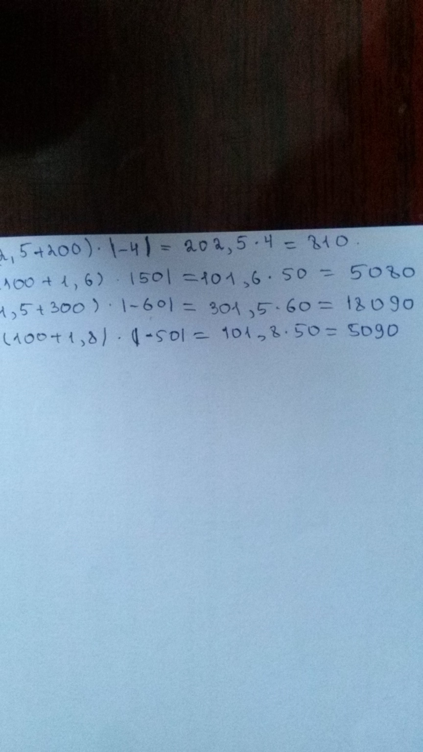используя расприделительное свойство умножения, вычитания1)(2,5+200)×|-4| 2)(100+1,6)×|50| 3)(1,5+300)×|-60| 4)(100+1,8)×|-50|
