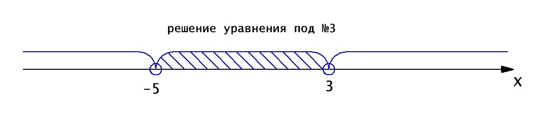 Значит, отрицательным наше исходное неравенство будет при следующих значениях икс: x<-5 и x>3. Такой ответ обычно обводится фигурной скобкой, как система неравенств, либо отображается на числовой оси.