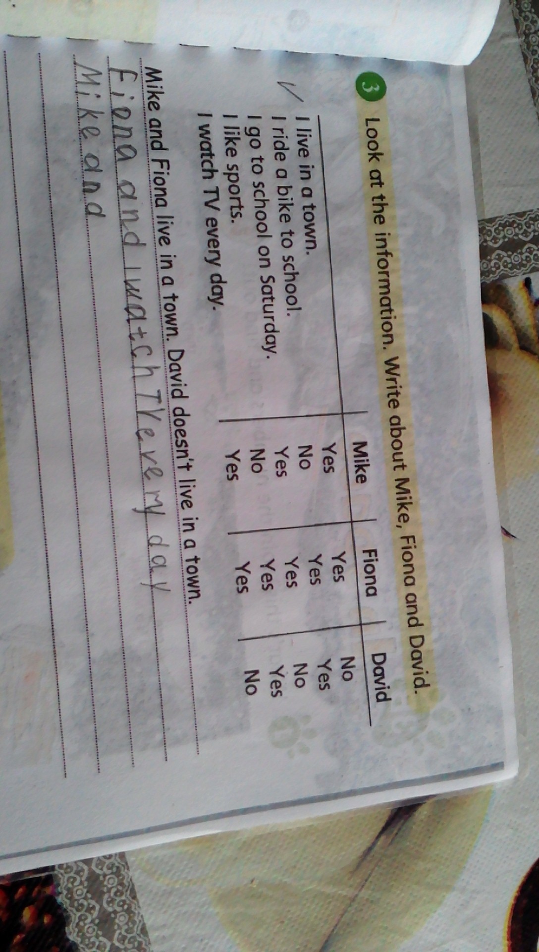 2)Fiona and David ride a bike to school.Mike doesnt ride a bike to school
