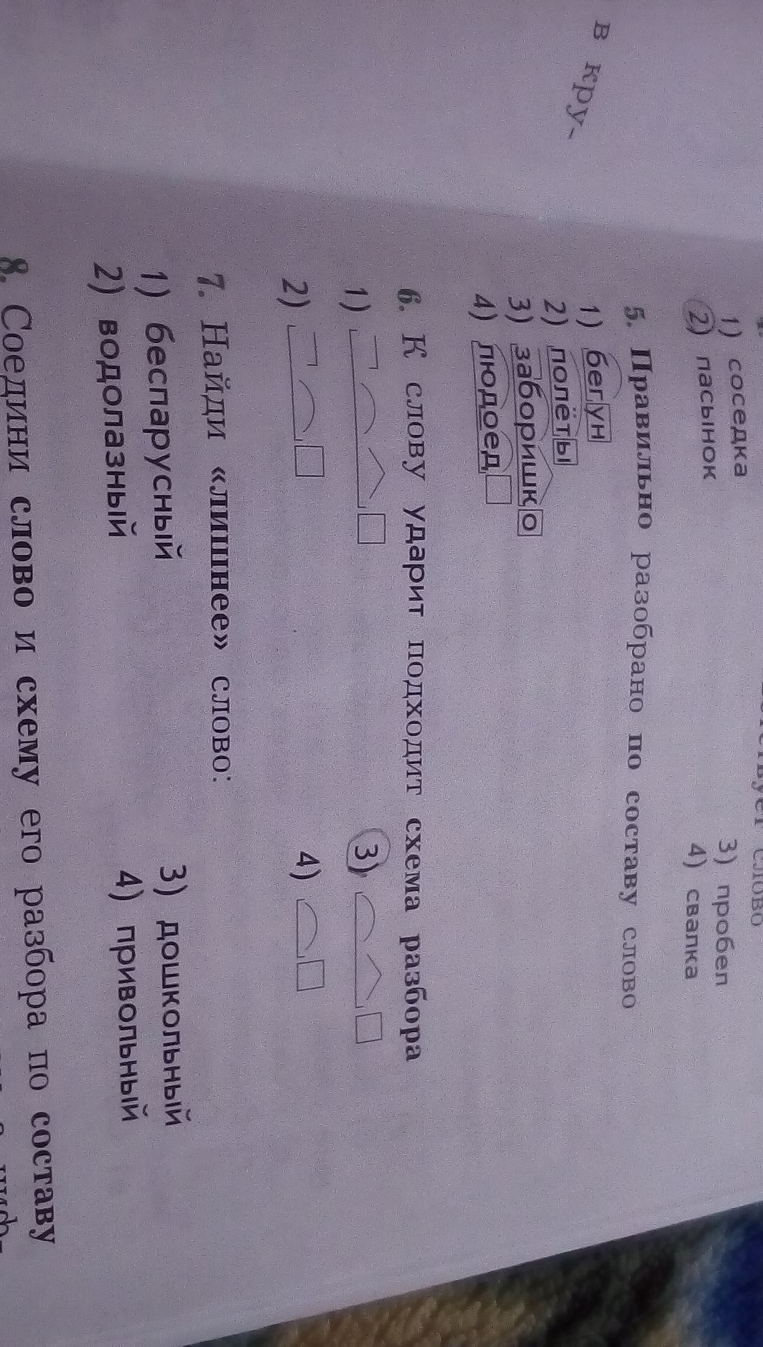 в пятом упр. правильно так слова полеты приставка по корень лет окончания ы, а в седьмом упр. там лишние слово водолазный