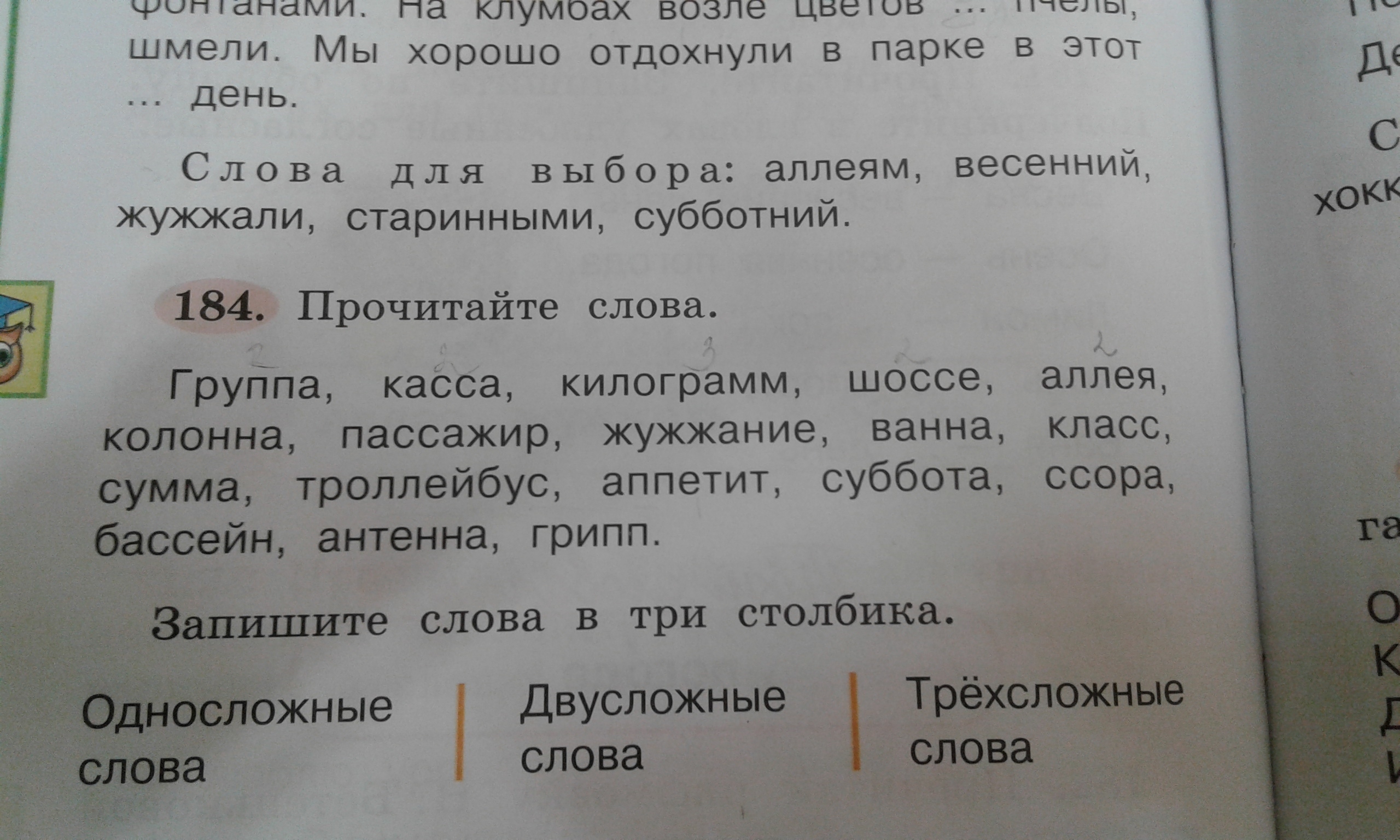 Груп-па, кас-са, ки-ло-грам, шос-се, ал-лея, ко-лон-на,пас-са-жир,жуж-жа-ние,ван-на,кла-сс, сум-ма, трол- лей-бус,аппе-тит,суб-бо-та,ссо-ра, бас-сейн,антен-на,гри-пп