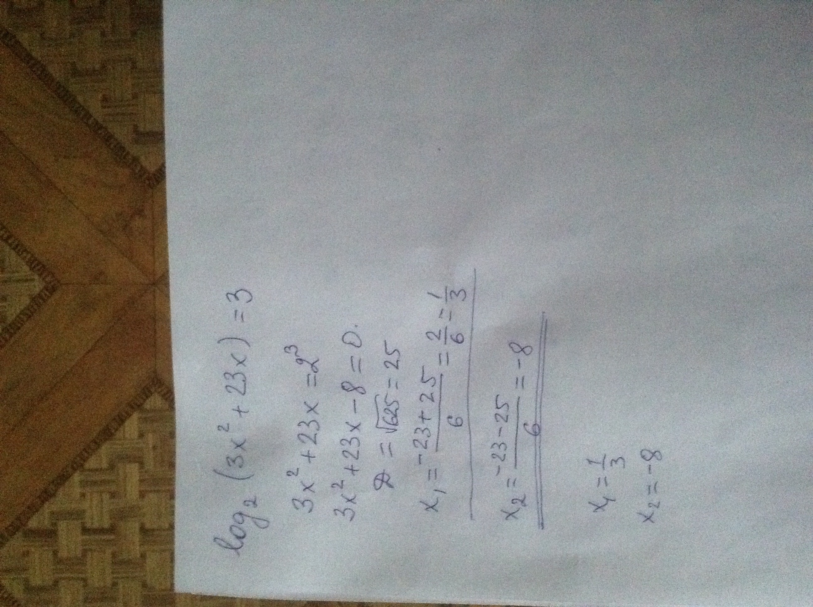 если вы проходили дискриминант то можно решить так: 3x +23x-3=0 a=3, b=23, c=-3 D=b^2-4ac D=23^2-4*3*(-3)=529+36=565 X=-b+-корень из D/2a x= 23+-корень из 565/2а x=23+-23.7 x=23+23.7= 46.7 x=23-23.7=-0.7