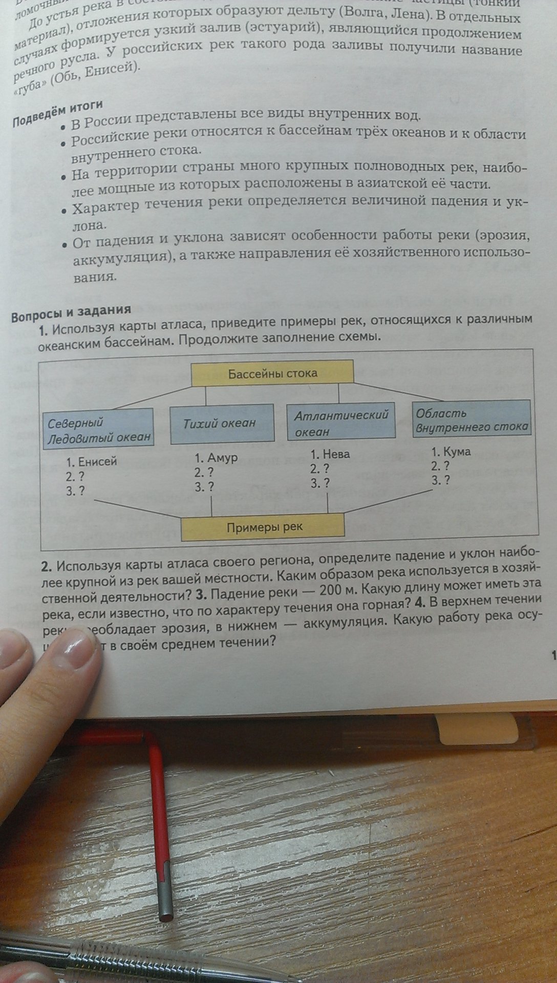 используя карты атласа, приведите примеры рек, относящихся к различным океанским бассейнам. Продолжите заполнение схемы.