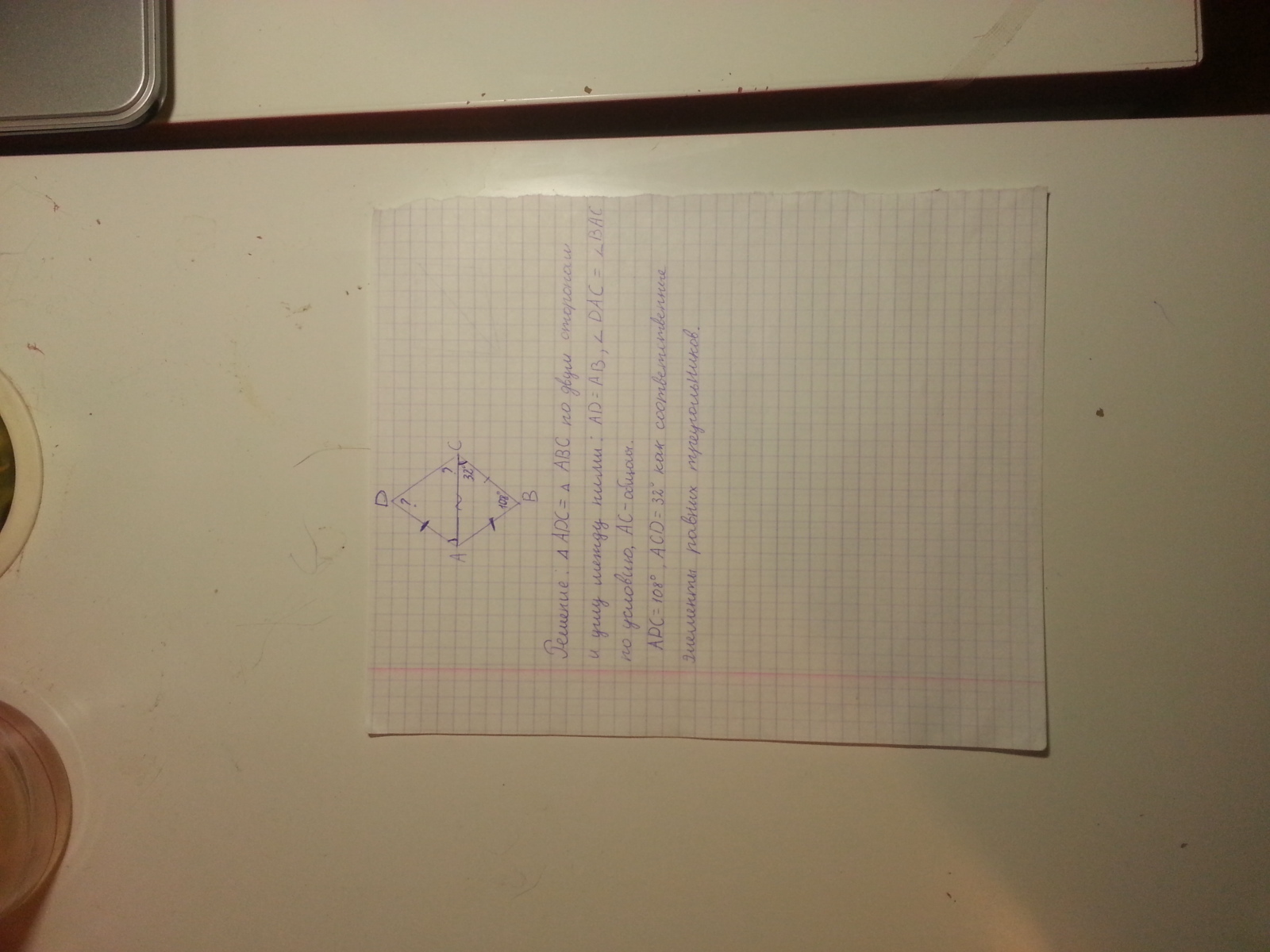 задача по геометрии докажите равенство треугольников ABC и ADC если BC=AD и угол 1 равен углу 2 найдите угол ACD и угол ADC если угол ABC= 108° и угол BAC= 32°