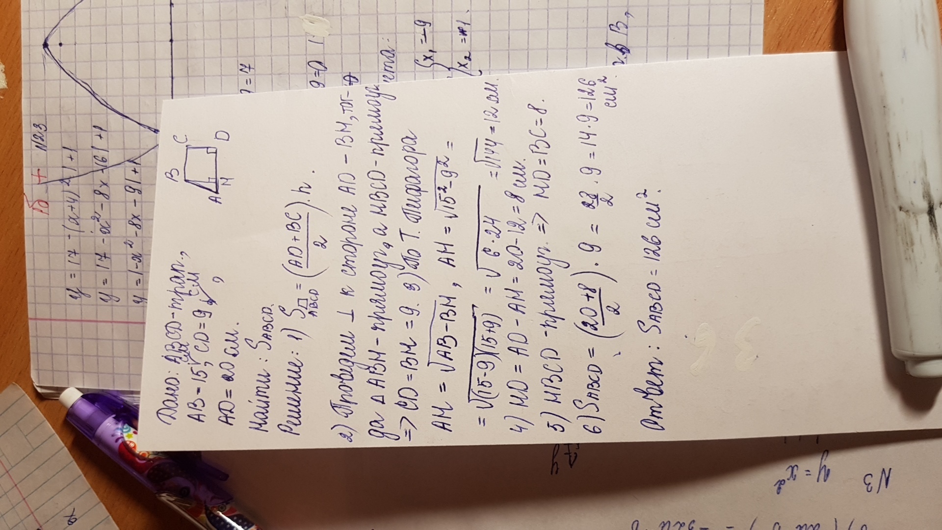 В прямоугольной трапеции боковые стороны равны 15 см. и 9 см., а большее основание равно 20 см.. Найдите площадь трапеции.