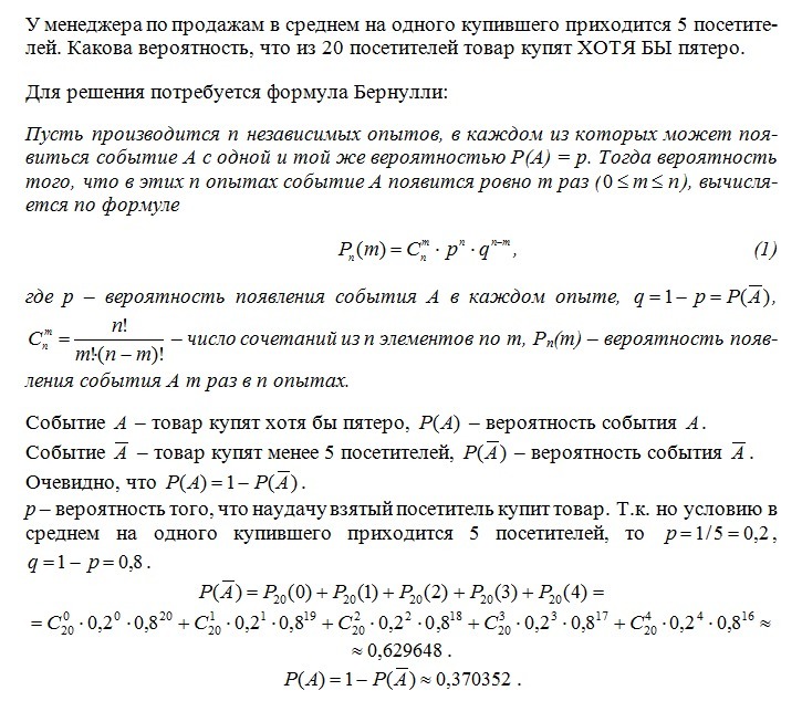 У менеджера по продажам в среднем на одного купившего приходится 5 посетителей. Какова вероятность, что из 20 посетителей товар купят ХОТЯБЫ пятеро.