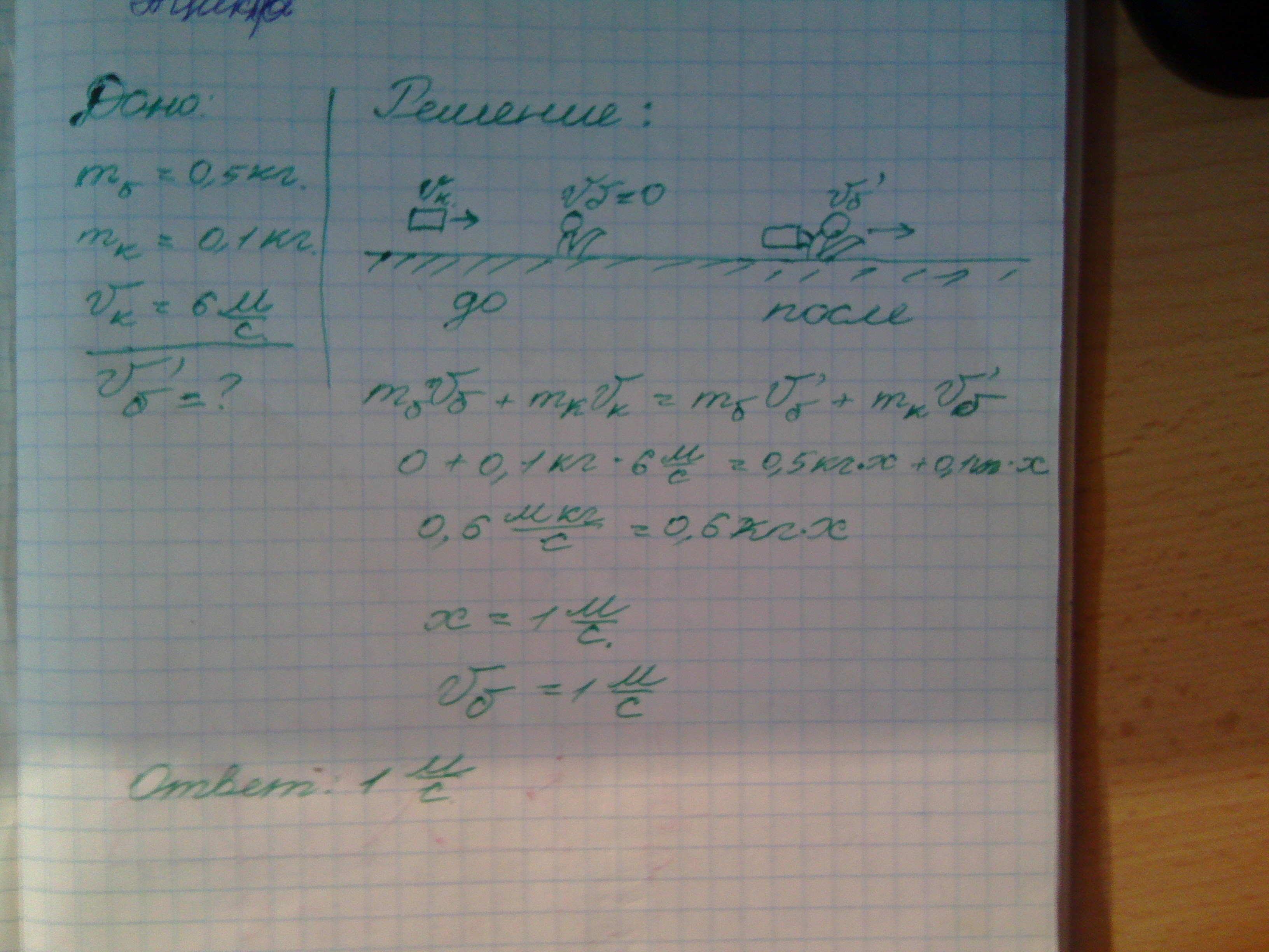 Белка массой 0,5 кг сидит на абсолютно гладкой, обледенелой, горизонтальной, плоской крыше. Человек бросает белке камень массой 0,1 кг. Камень летит горизонтально со скоростью 6 м/с. Белка хватает камень и удерживает его. Вычислите скорость белки, поймавшей камень. Пожалуйста надо еще рисунок "До и после"