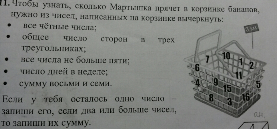 Чтобы узнать,сколько Мартышка прячет в корзине бананов,нужно из чисел,написанных в корзине вычеркнуть: