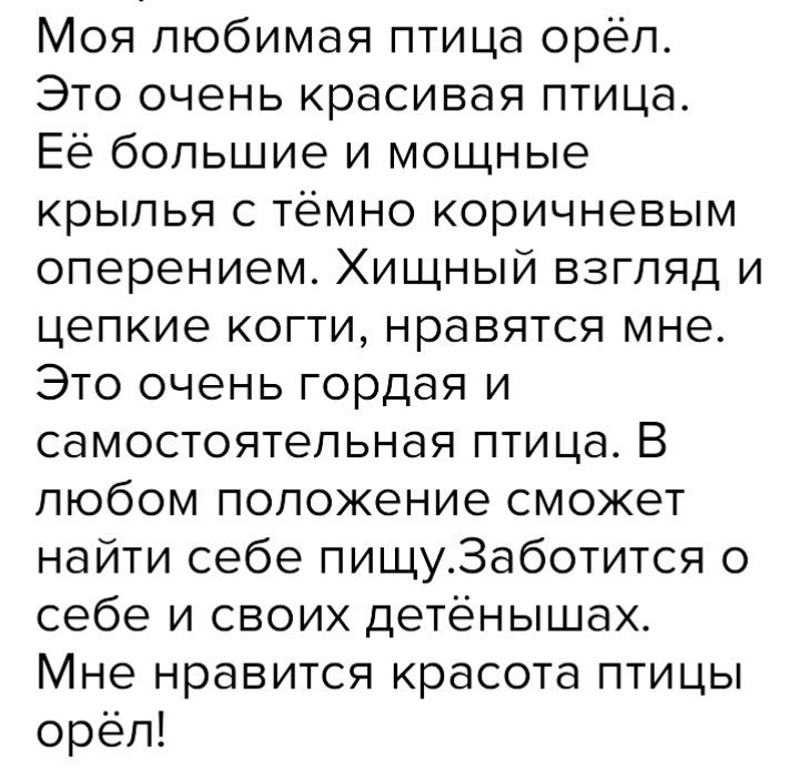 Менің сүйікті құсым бүркіт. Бұл өте сұлу құс. Оның үлкен және қуатты қанаттары қою қоңыр қауырсындардан тұрады. Жыртқыш көзқарасы мен жабысқыш тұяқтары маған ұнайды. Бұл өте тәкәппар, өзінше өмір сүретін құс. Кез келген жағдайда тамағын тауып жейді. Өзі мен балаларына қамқор болады. Маған бүркіттің сұлулығы ұнайды.