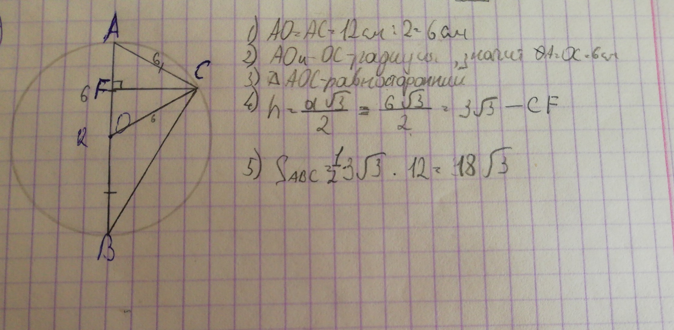 отрезок АВ является диаметром окружности центр которой - точка О.Точка С лежит на окружности, АО=АС. Вычислите площадь треугольника АВС и расстояние от точки С до прямой АВ, если АВ = 12см. Пожаааааалуйсто ребятки! помогите! очень пошууу!!! Перечислю ещё пунктов кто решит!