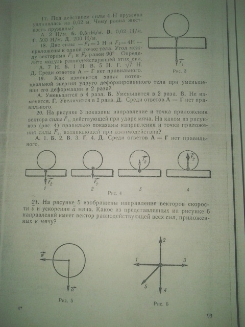 20. На рисунке 3 показаны направление и точка приложения вектора силв F1, действующей при ударе мяча. На каком из рисунков (рис.4) правильно показаны направления и точка приложения силы F2, возникающей при взаимодействии?