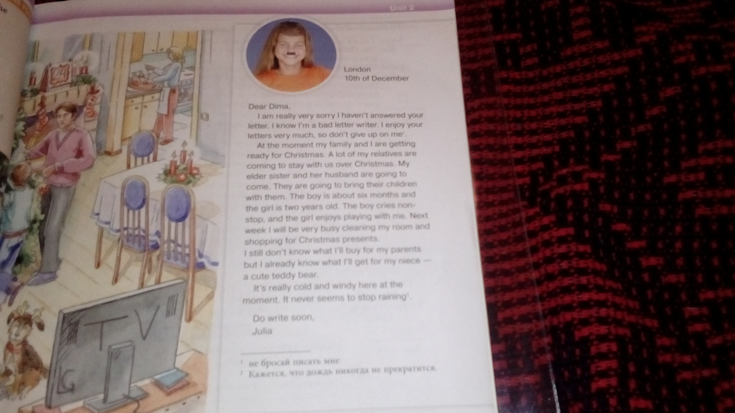 На данный момент я с семьей готовлюсь к рождеству. Много моих друзей и знакомых собираются провести рождество с нами. Моя старшая сестра и ее муж тоже приедут. А еще они приведут своих детей с собой. Их мальчику около шести месяцев, девочке - два года. Мальчик постоянно плачет, а девочка получает удовольствие от игры со мной. На следующей неделе я буду очень занят убирая мою комнату и покупая подарки перед рождеством. Я все еще не знаю, что купить моим родителям, но я уже определился с подарком для племянницы - милый плюшевый мишка.