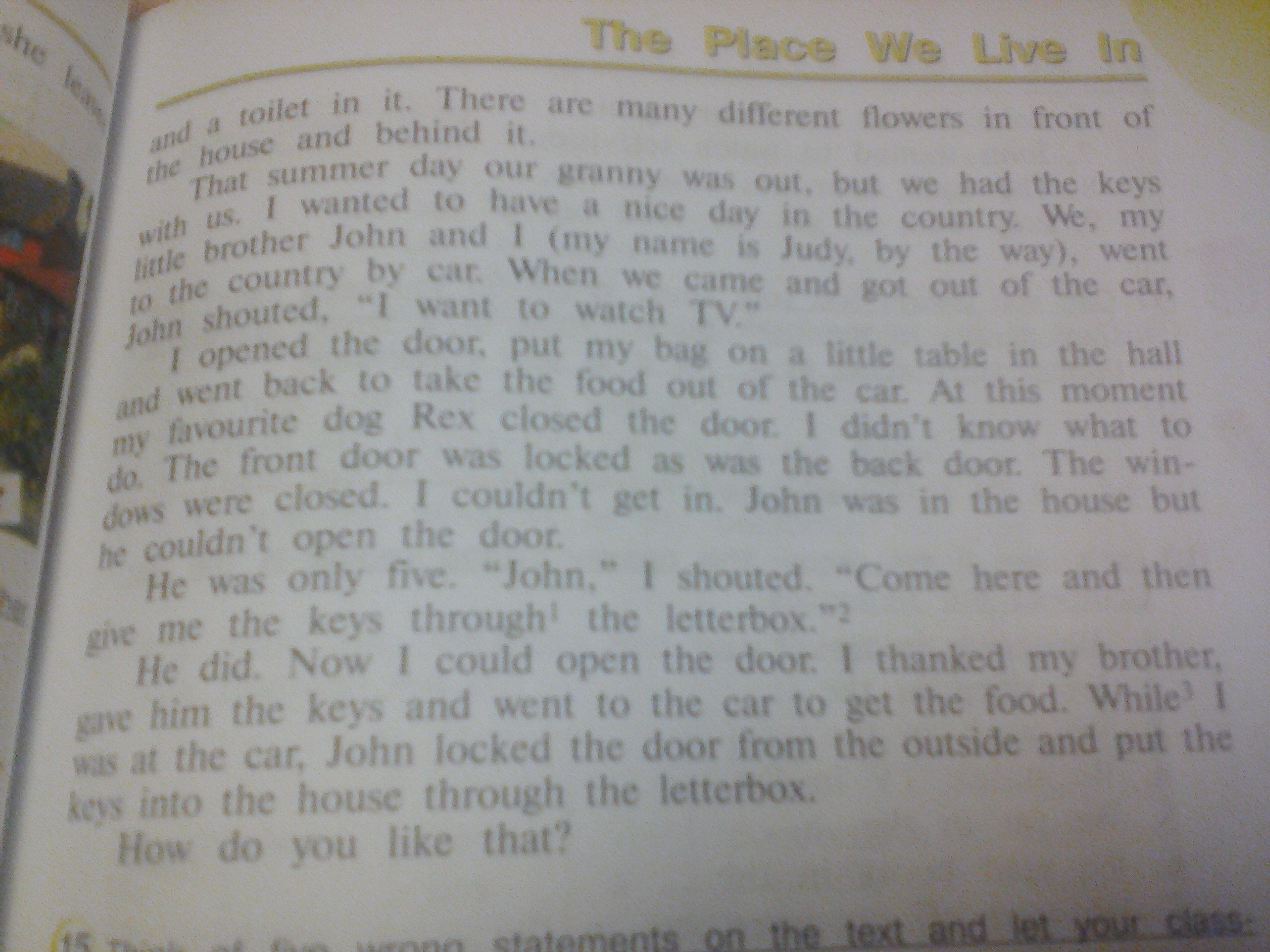 В этот летний день наша бабушка ушла(умерла), но у нас остались ключи от него(от дома. Вы первую часть текста не прислали). Я решила провести хороший день в деревне(за городом). Мы, мой младший брат Джон, и я(меня зовут Джуди, между прочим), поехали в деревню(за город) на машине. Когда мы приехали и вышли из машины, Джон крикнул:"Я хочу посмотреть телевизор"