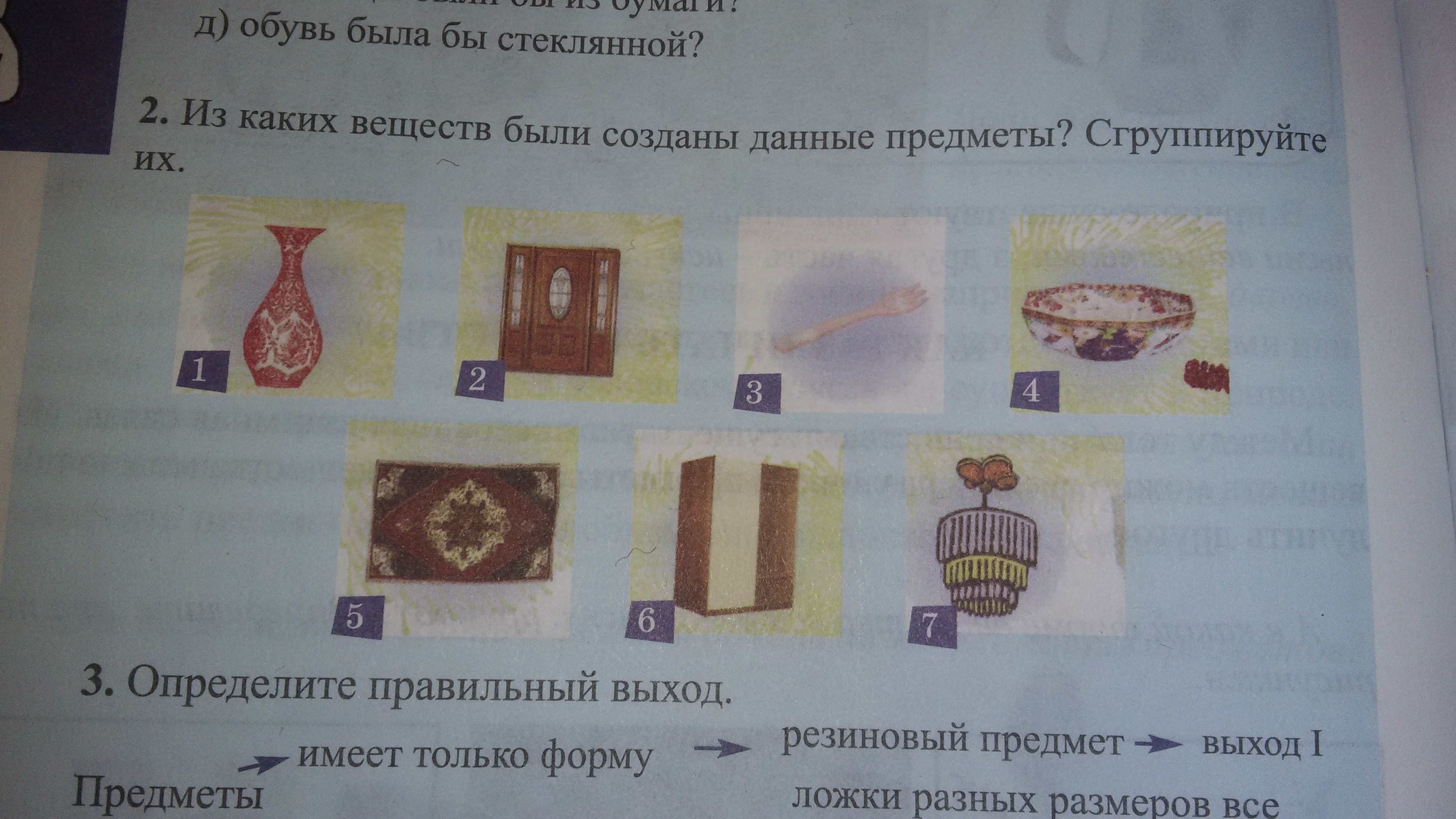 номера1,4,7- ваза, люстра, чаша- изделия из стекла. номер2,6- шкафы- из дерева, древесных опилок, есть элементы стекла и пластика. номер 3- металл. номер5- ковёр, может быть из искусственно( синтетической) нити или натуральный( из шерстяной нити)