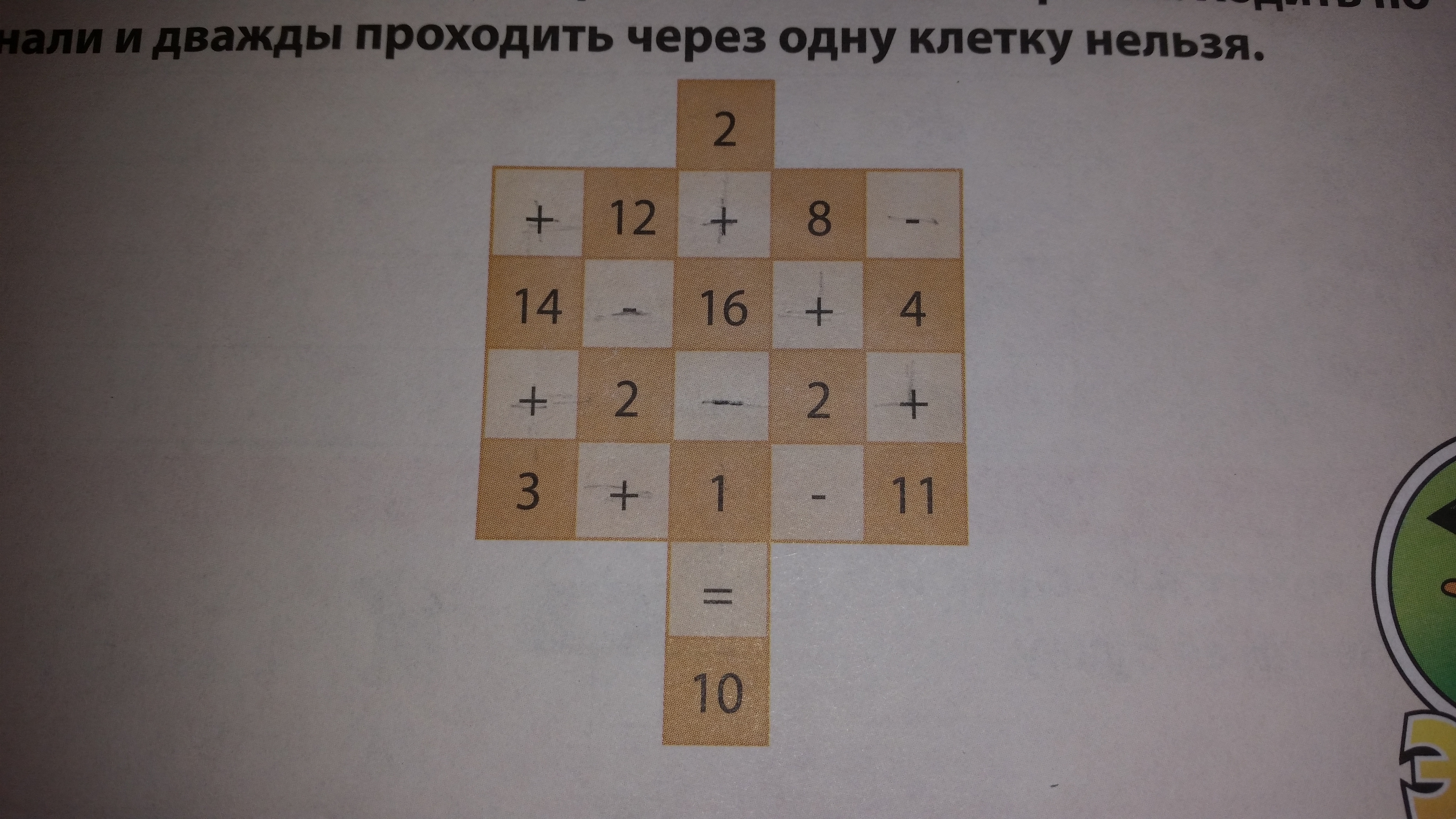 Найди и нарисуй верный путь от верхней клеткис цифрой 2 до нижней клетки с числом 10 так,чтобы равенство было верным.Ходить по диоганали и дважды проходить через одну клетку нельзя.