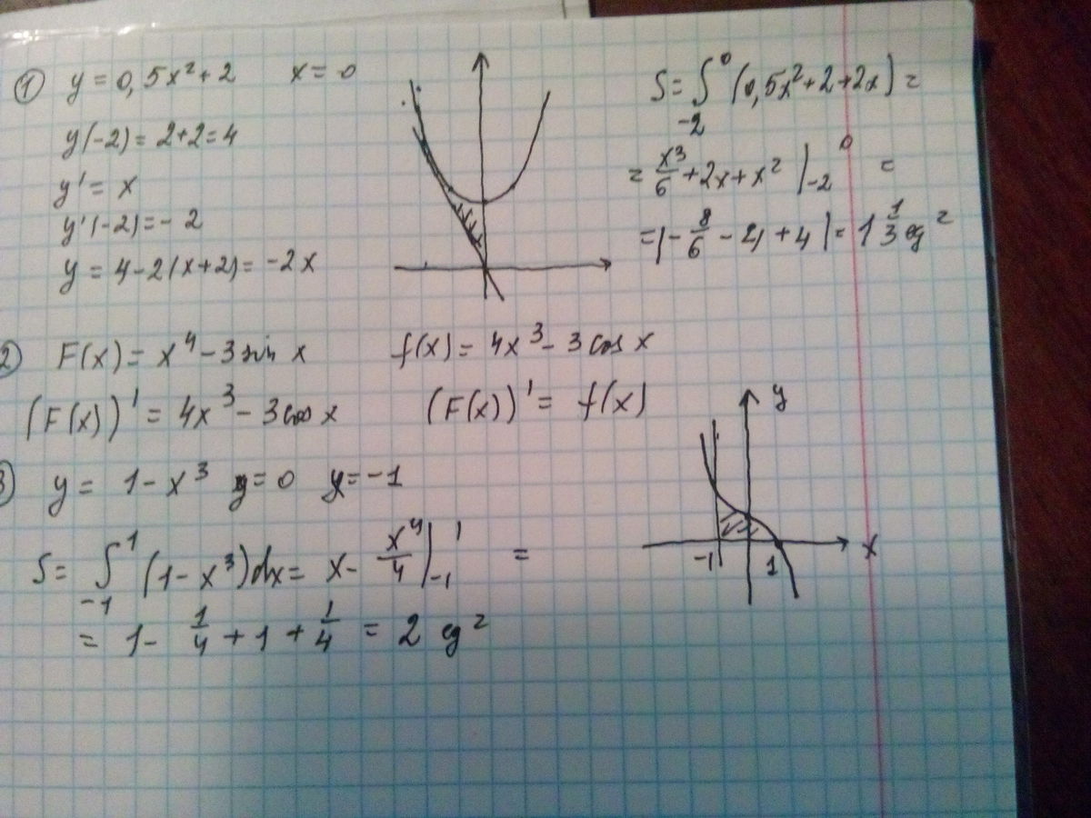 2.Докажите, что F(x)=x^4-3sin x яв-ся первообразной для f(x)=4x^3-3cos x 3.Вычислите площадь фигуры, ограниченной линиями: y=1-x^3, y=0, x=-1