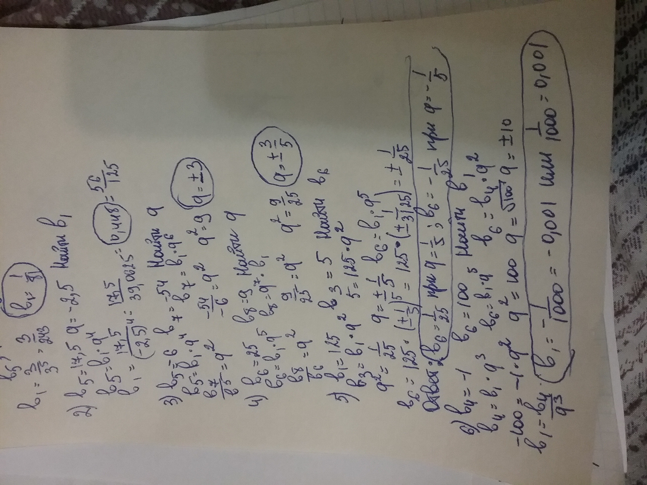 для геометрической прогрессии bn найдите 1)в1 если в6=3. q=3 .2)в1 если в5=17,5. q=-2,5. 3)q если в5=-6. в7=-54. 4)q если в6=25.в8=9. 5)в6 если в1=125. в3=5. 6)в1 если в4=-1 в6=100