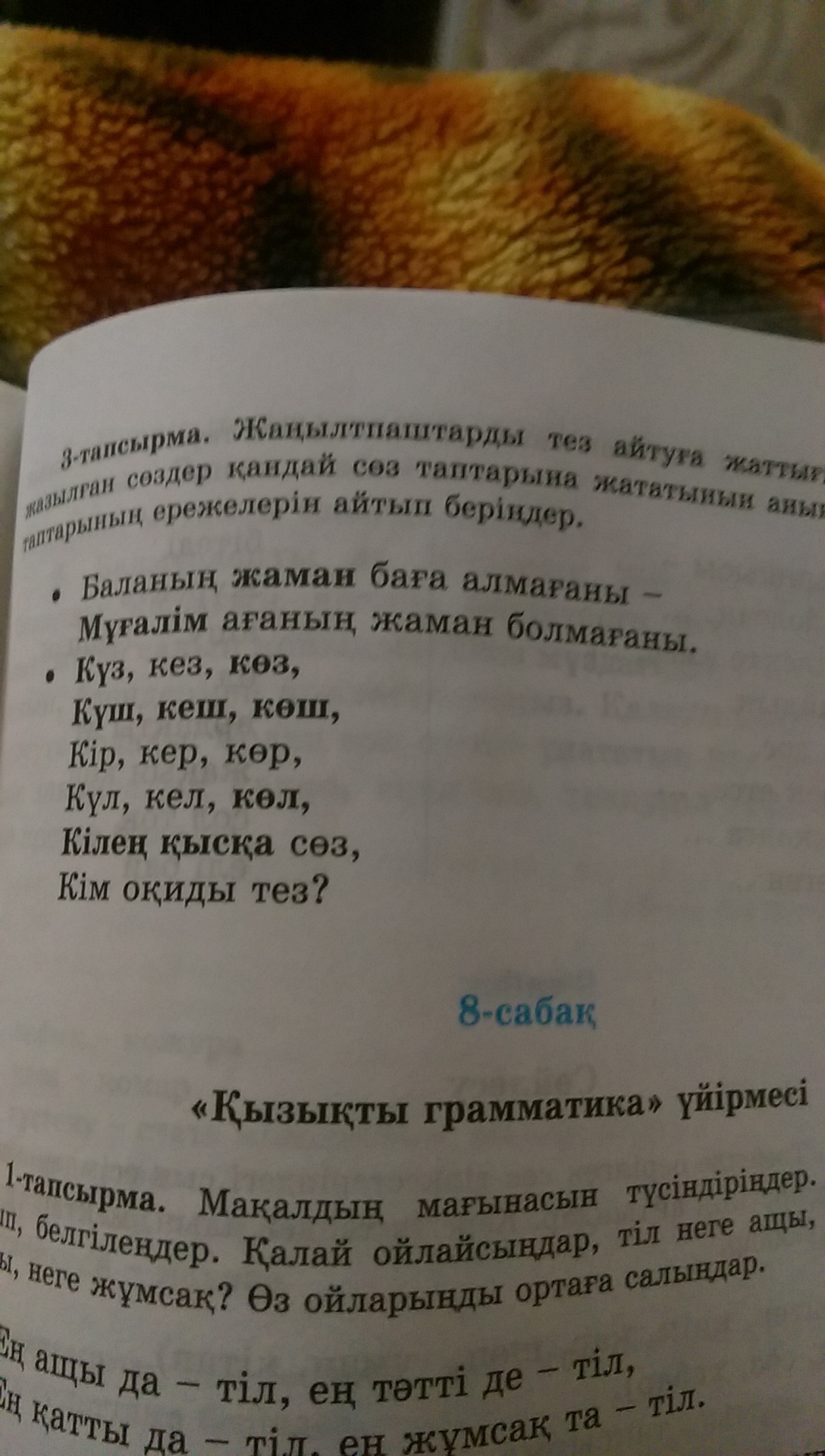 жаман -сын есім.мұғалім-зат.е.күз,көз,күш,көз,көл-зат.е.кілең қысқа-сын.е.кеш-есімдік