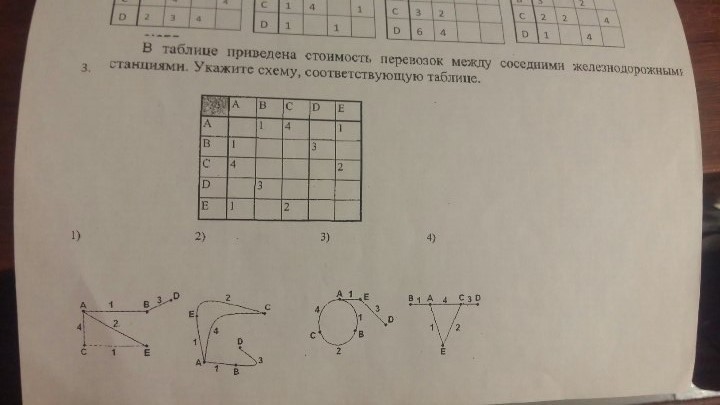 Второй, поскольку по таблице явно можно заметить, что между станциями Б и Д есть связь и, поскольку стоимость проезда A E =1, а под данные параметры подходит только 2-ая схема