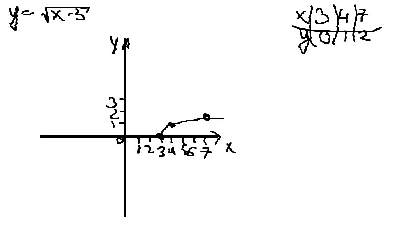 постройте график по функции,желательно прикрепите фотографию с начерченным графиком у= корень х-3