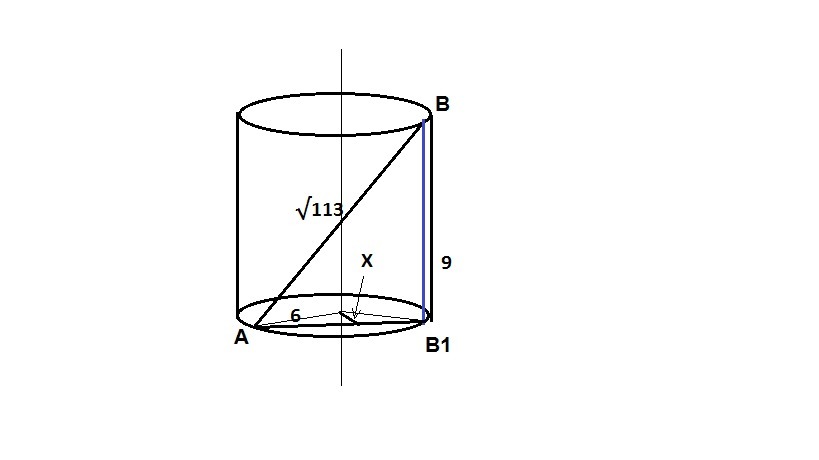 высота и радиус основания цилиндра соответственно равны 9 и 6, концы отрезка АВ длиной (корень из 113) лежат на окружностях верхнего и нижнего оснований. Найдите расстояние от оси цилиндра до отрезка АВ.