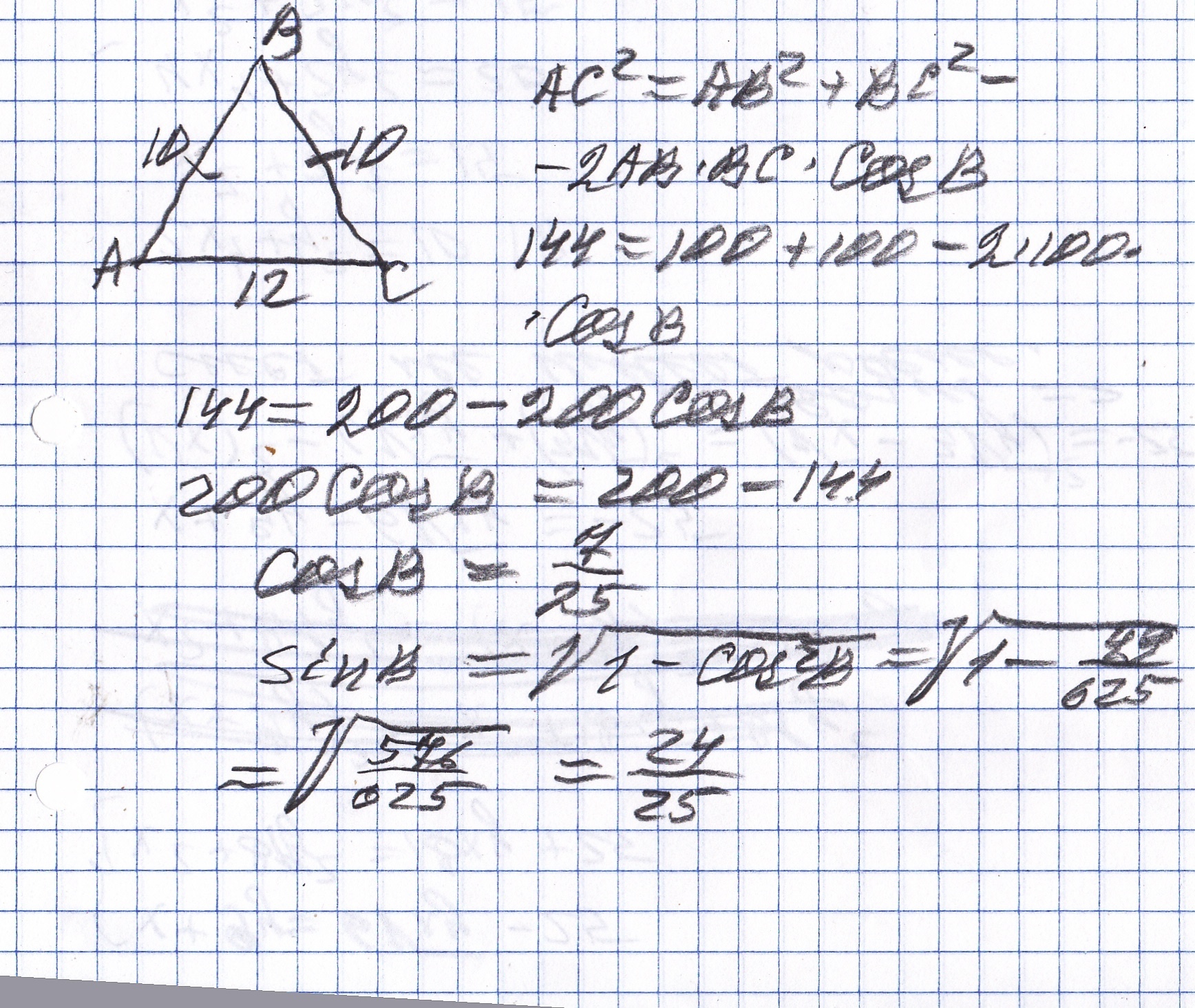 В равнобедренном треугольнике ABC AB=BC=10, AC=12. Найдите синус угла B