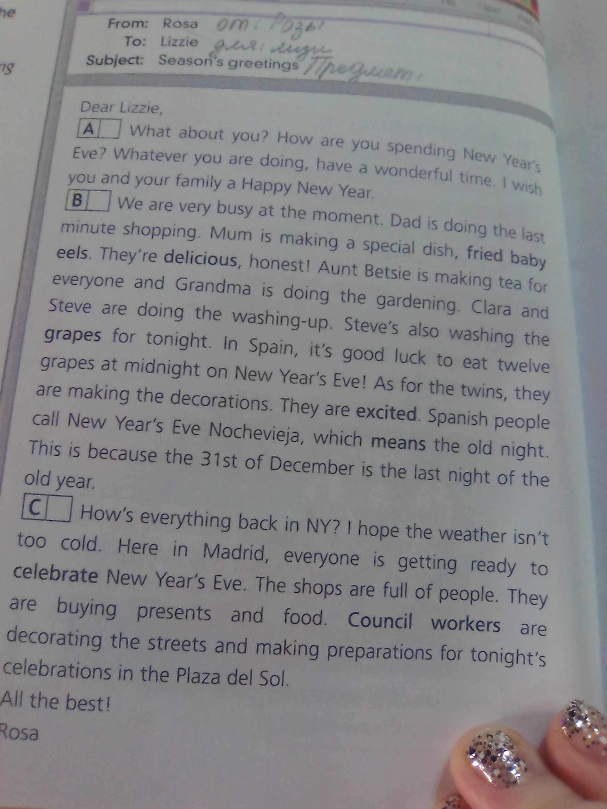 Як щодо вас? Як ти проводиш Новий рік, Єва? Все, що ви робите, приємно провести час, я бажаю Вам і Вашій родині щасливого Нового Року B Ми дуже зайняті в даний момент. Папа робить останню хвилину торговий мама робить спеціальне блюдо, смажені дитячі вугри. Вони смачні, чесне слово! Тітка Бетсі робить чай для всіх, і бабуся робить садівництві. Клара і Стів роблять мити посуд. Стів також промивання виноград на сьогодні. В Іспанії, це удача, щоб з'їсти дванадцять виноградин опівночі Evel Нового року Що стосується близнюків, вони роблять прикраси. Вони збуджуються іспанські люди називають новорічний Nochevieja, що означає стару ніч. Це пояснюється тим, що 31 грудня остання ніч старого року