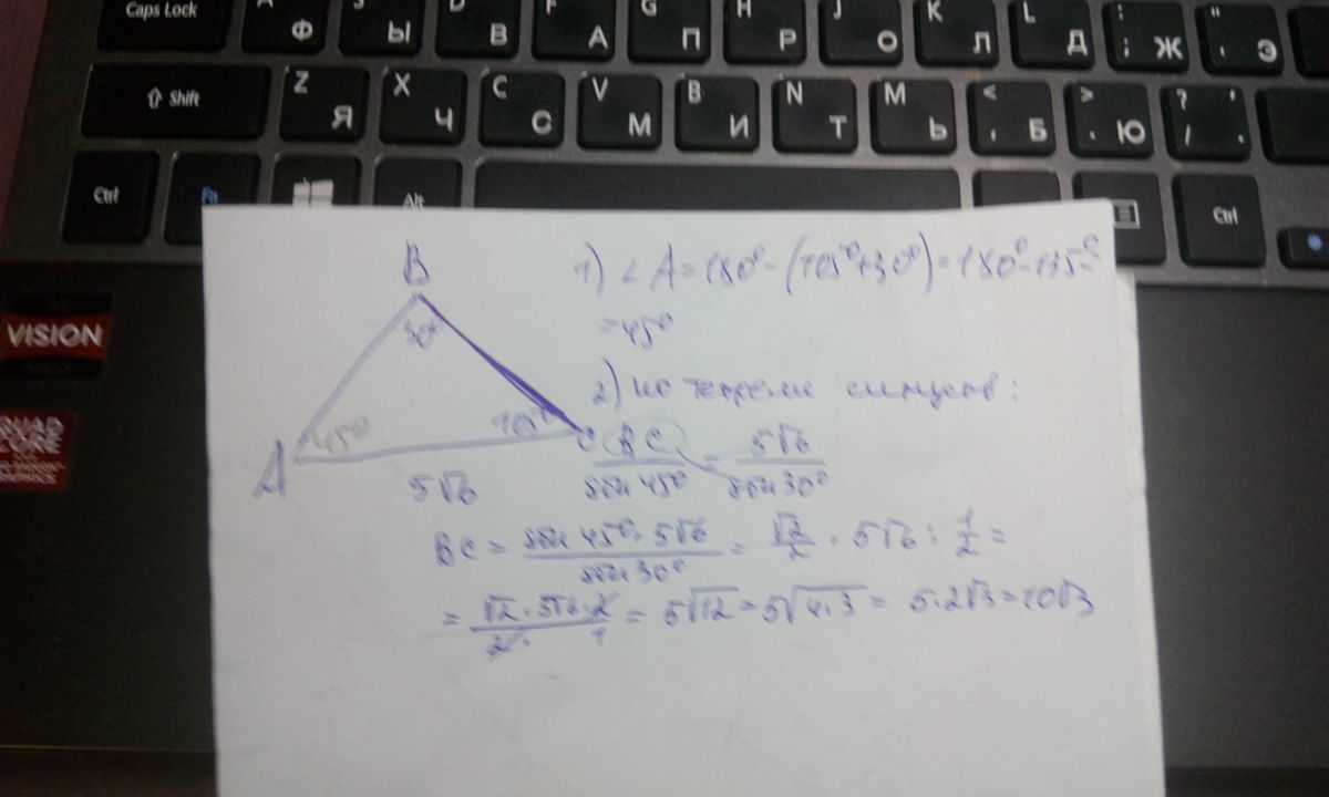 В треугольнике abc известно, что ac=5 корень из 6, угол B=30, угол С=105. Найдите длину стороны BC.
