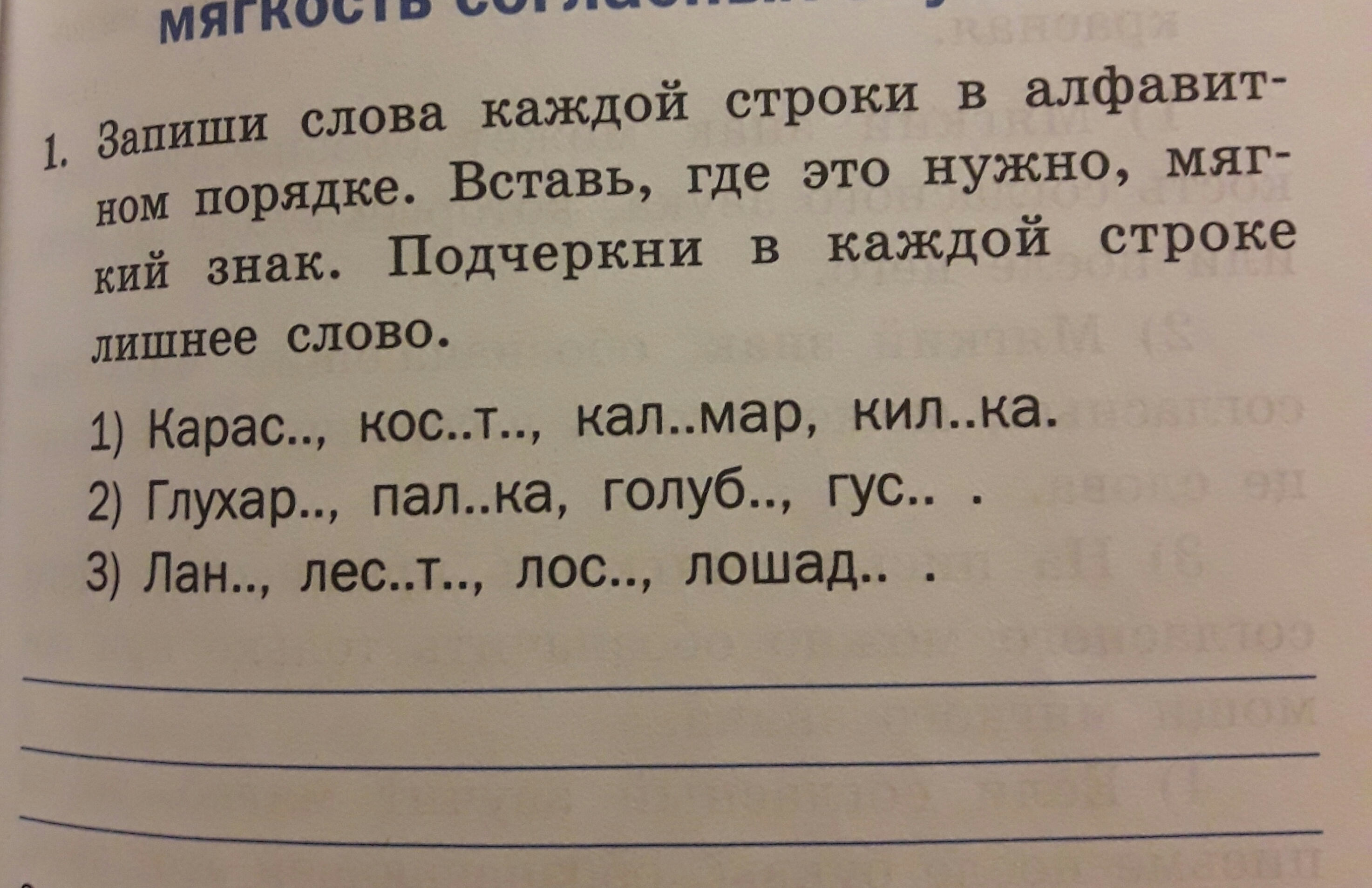 Запиши слова каждой строки в алфавитном порядке. Меня интересует вопрос только как записать их в алфавитном порядке, начинаются все на одинаковую букву. Фото приложила. Спасибо.