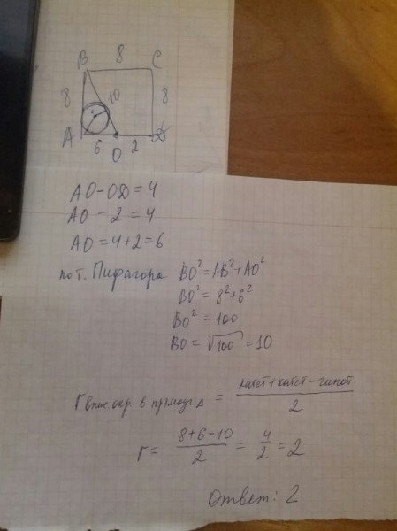 Точка О лежит на стороне AD квадрата ABCD. Вычислите длину радиуса окружности, вписанной в треугольник АОВ, если известно что OD=2 см и AO-OD=4 см.