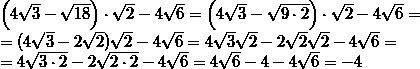 left(4sqrt3-sqrt{18}right)cdotsqrt2-4sqrt6=left(4sqrt3-sqrt{9cdot2}right)cdotsqrt2-4sqrt6=\=(4sqrt3-2sqrt2)sqrt2-4sqrt6=4sqrt3sqrt2-2sqrt2sqrt2-4sqrt6=\=4sqrt{3cdot2}-2sqrt{2cdot2}-4sqrt6=4sqrt6-4-4sqrt6=-4