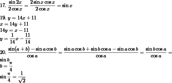 17. Sin2x /2cosx =2sinx*cosx / 2cosx=sinx