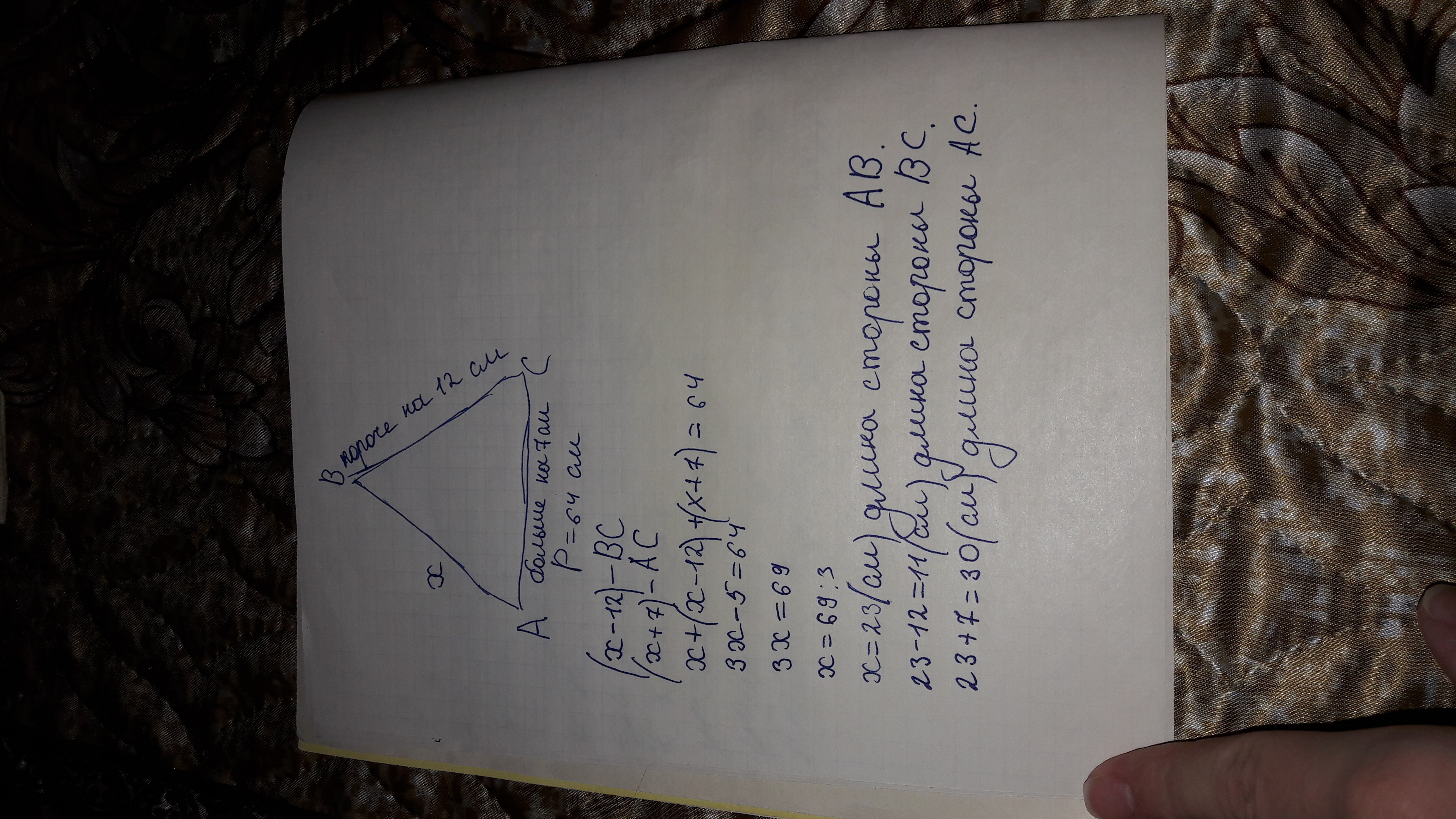 Периметр треугольника АВС равен 64 см, сторона АВ меньше стороны АС на 7 см, но больше стороны ВС на 12 см. Найдите длину каждой стороны треугольника АВС.