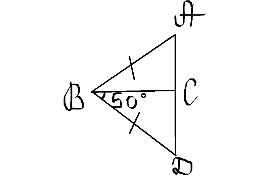 Треугольник ДВА равнобокий (ДА - основание), значит ВС - высота, медиана и биссектриса, отсюда угол АВС= углу ДВС =50 градусов