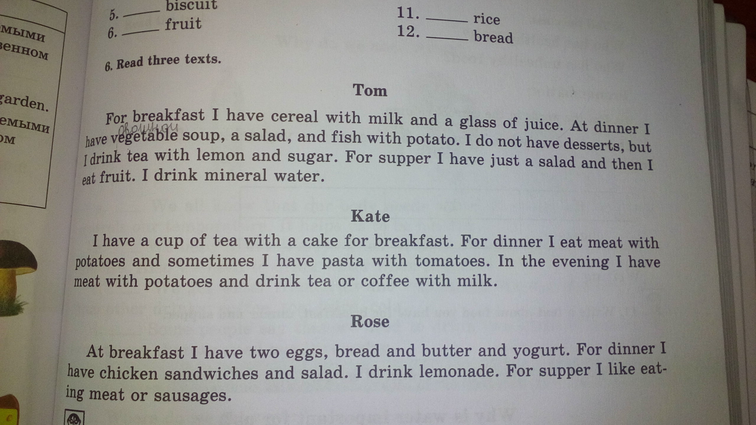На завтрак у меня хлопья с молоком и стакан сока. На обед я ем овощной суп, салат и рыбу с картошкой. Я не ем десертов, но пью чай с лимоном и сахаром. На ужин я просто ем салат и потом ем фрукты. Я пью минеральную воду.