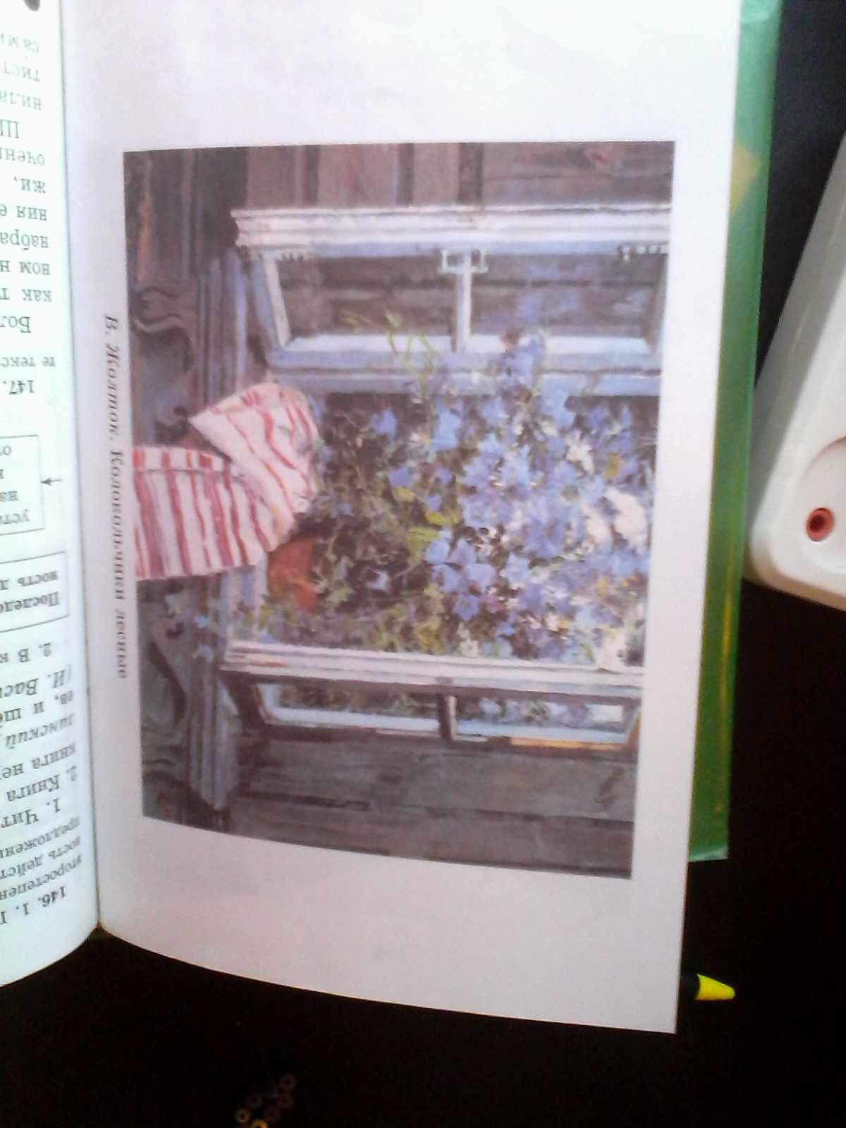 На одной из картин Жолтока изображены лесные колокольчики.Колокольчики стоят на окне.Тут есть и голубого,и лилового,и светло-сиреневого,и лазурного,и небесного цвета колокольчики.Видно,что от цветов идет не одурманивающий запах,а нежный,весенний,легкий аромат.Стоит солнечная погода,и лучи солнца падают на цветы.Цветы отражаются в открытом окне.Колокольчики собраны в многоцветковую метелку.