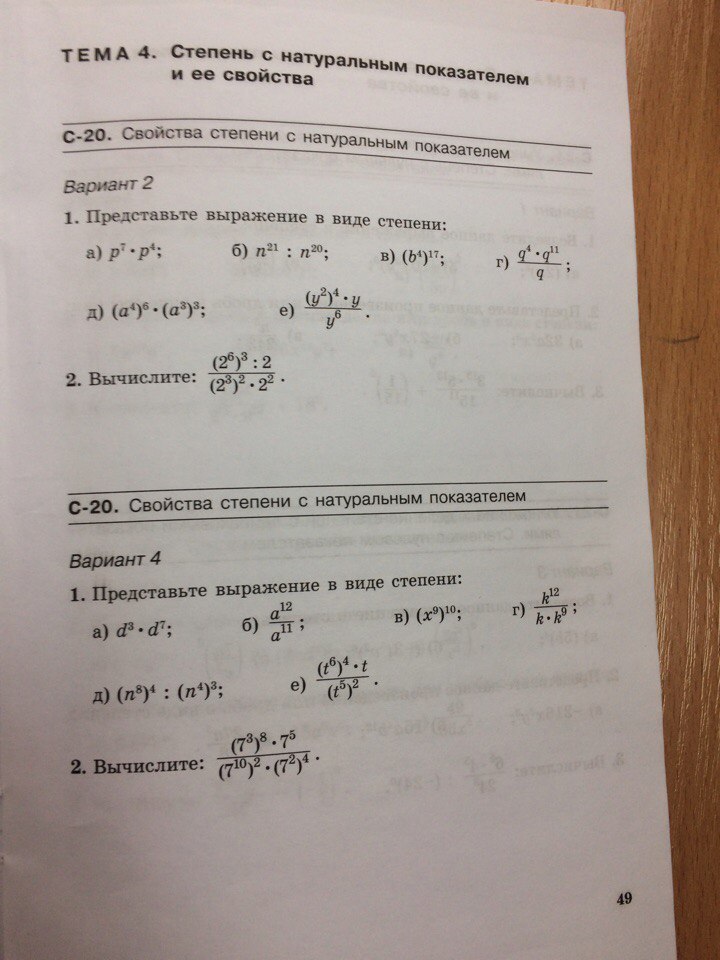2 вариант номер 1 а) p^11 б)n в) b^68 г)q^14 д)а^31 е)у^3 2 номер- 2^9=512 4 вариант номер 1 а)d^10 б)а в)x^90 г)k^2 д)n^20 е)t^15 2 задание 7^1=7