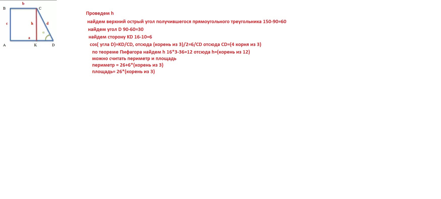 прямоугольная трапеция ABCD основания 10 и 16 угол c 150 градусов найдите периметр и площадь ПОМОГИТЕ ДАМ МНОГО БАЛЛОВ