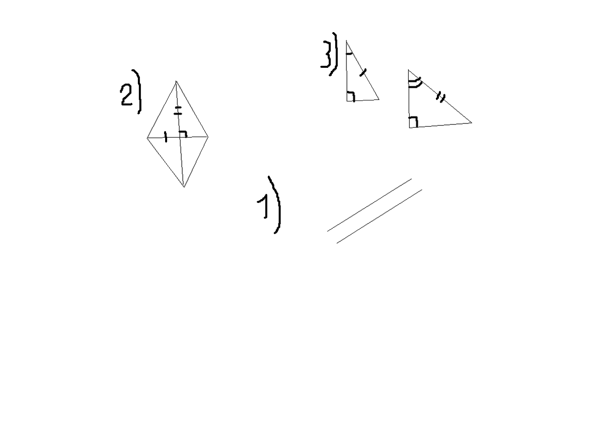 1) верно 2) неверно (диагонали ромба взаимно перпендикулярны, но не равны!) 3) неверно на примере можно построить разные прямоугольные треугольники.