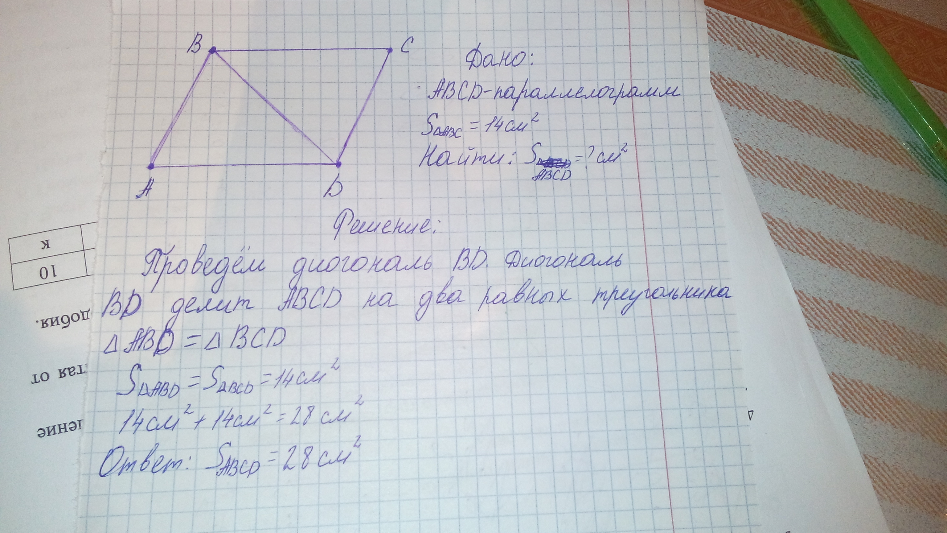 на рисунке abcd параллелограмм площадь треугольника abd равна 14 см^2 тогда площадь параллелограмма ABCD равна
