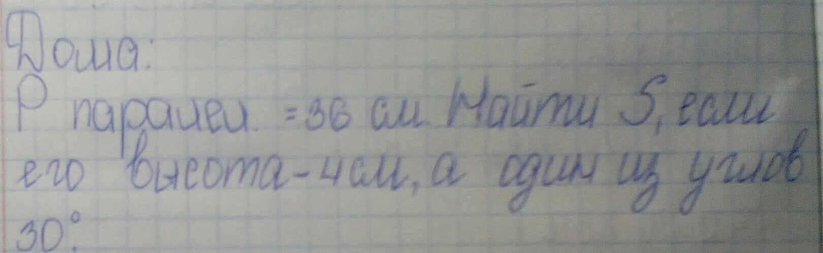 S-площадь, P=2x+2y, 36=2x+2y, x+y=18, x=18-y, S=x*y*sin30°=y*h,