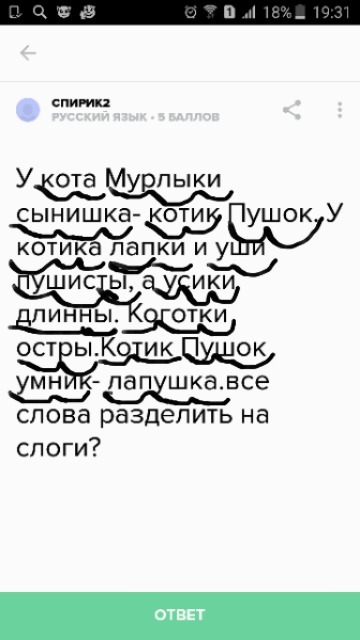У кота Мурлыки сынишка- котик Пушок. У котика лапки и уши пушисты, а усики длинны. Коготки остры.Котик Пушок умник- лапушка.все слова разделить на слоги?