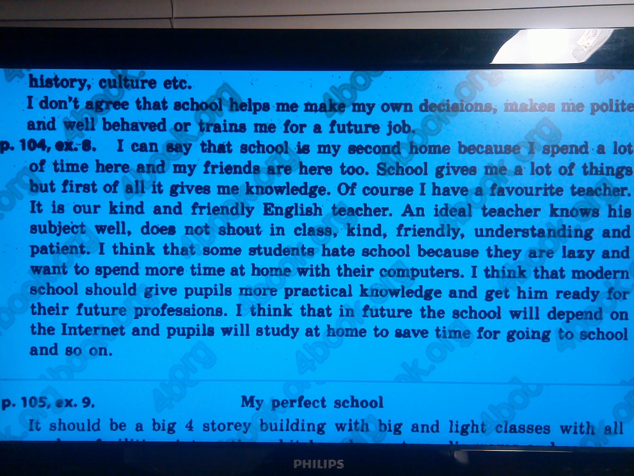 Я могу сказать , что школа это мой второй дом потому что я провожу много времени здесь и тоже тут. Школа дает мне много вещей но первое из которых- знание. Конечно, у меня есть любимый учитель. Это наш добрый и дружелюбней учитель английского языка. Идеальный учитель хорошо знает свой предмет, не кричит в классе, добрый , дружелюбный , понимающий и терпеливый. Я думаю, что многие ученики ненавидят школу , потому что они ленивые и хотят проводить больше времени дома за компьютером . Я думаю , что современные школы должны давать ученикам больше знаний и подготовить их будущей профессии . Я думаю , что в будущем школа будет зависеть от интернета и ученики будут учиться дома , для того чтобы сохранить время и так далее. :)
