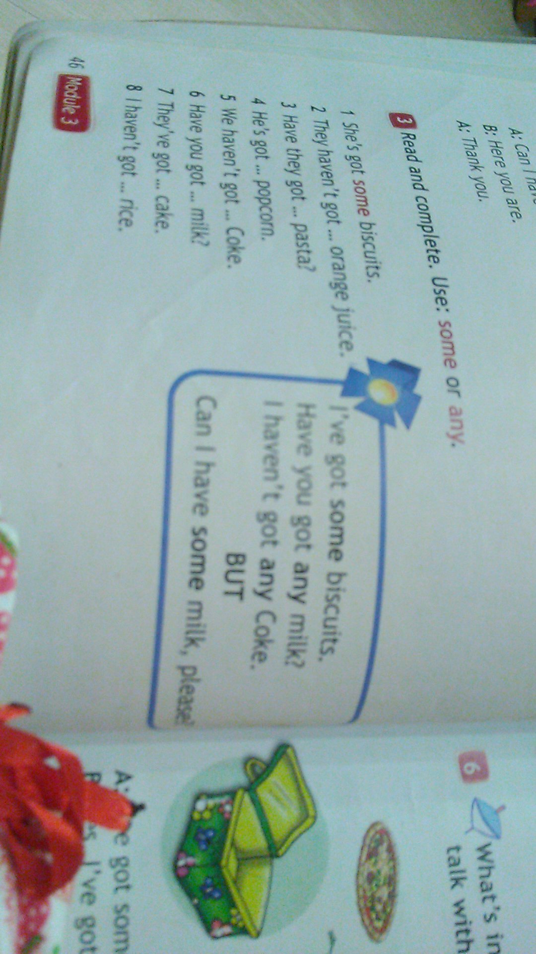 Смотри, слово "any" употребляется в негативных и восклицательных предложениях, а слово "some" только в положительных предложениях. Соответсвенно ответы будут таковыми: 1 - some (это уже показано в книге как образец)