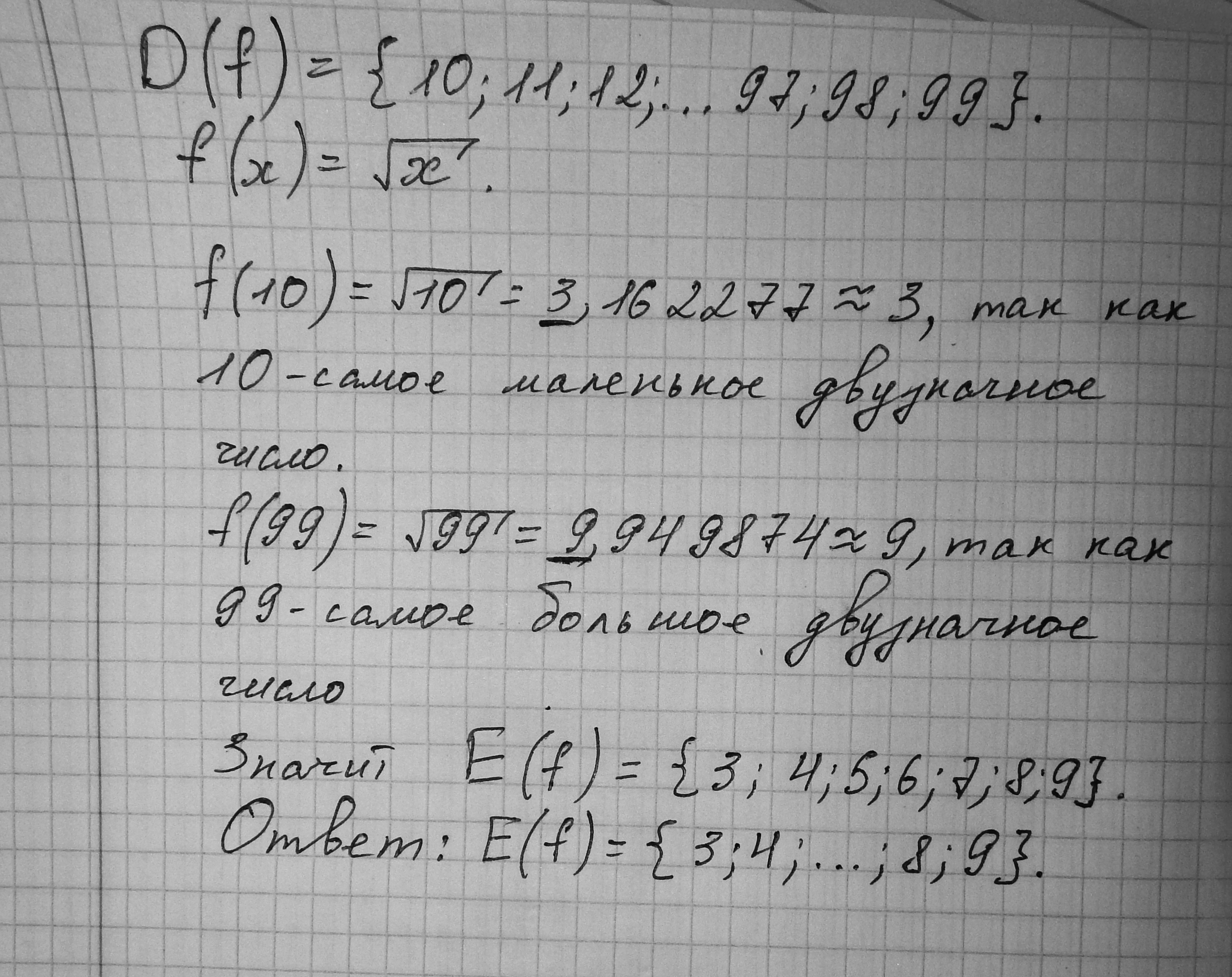 Функция у = f(x) задана на множестве X всех двузначных натуральных чисел с помощью следующего правила: каждому числу х из X ставится в соответствие целая часть квадратного корня из числа х. Найдите область значений данной функции.