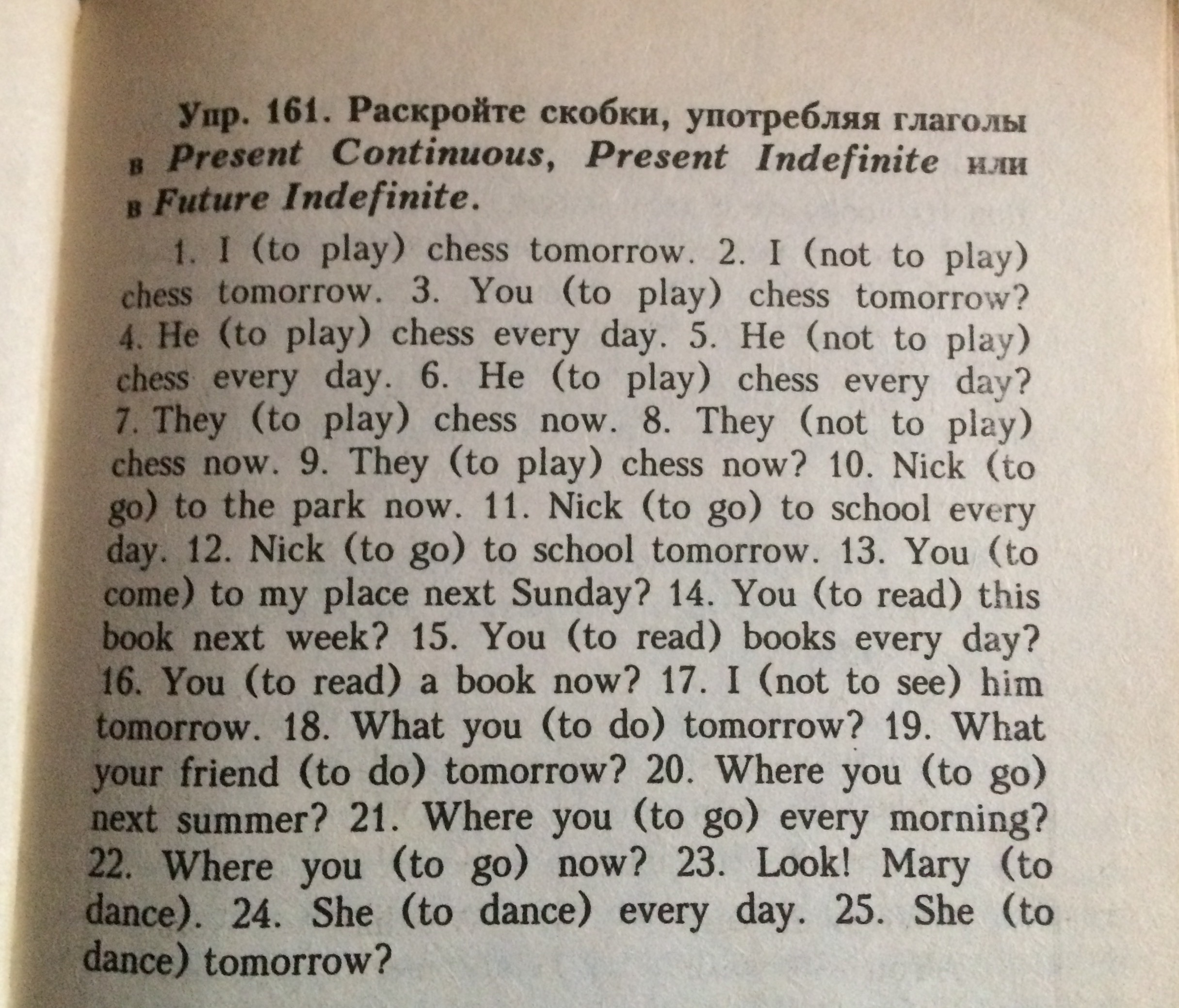 1) will play 2) Will not play 3) Will you play...? 4) plays 5) doen't play 6) Does he play...? 7) they are playing 8) are not playing 9)are they playing now? 10) is going 11) goes 12) will go 13) Will you come....? 14) Will you read...? 15) Do you read...? 16) Are you reading...? 17) won't see 18) What will you do..? 19) what will your friend do...? 20) Where are you going ...? 21) Where do you go...? 22) Where are you going now? 23) Mary is dancing 24) She dances 25) Will she dance tomorrow?